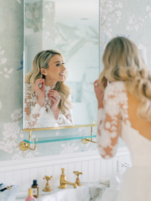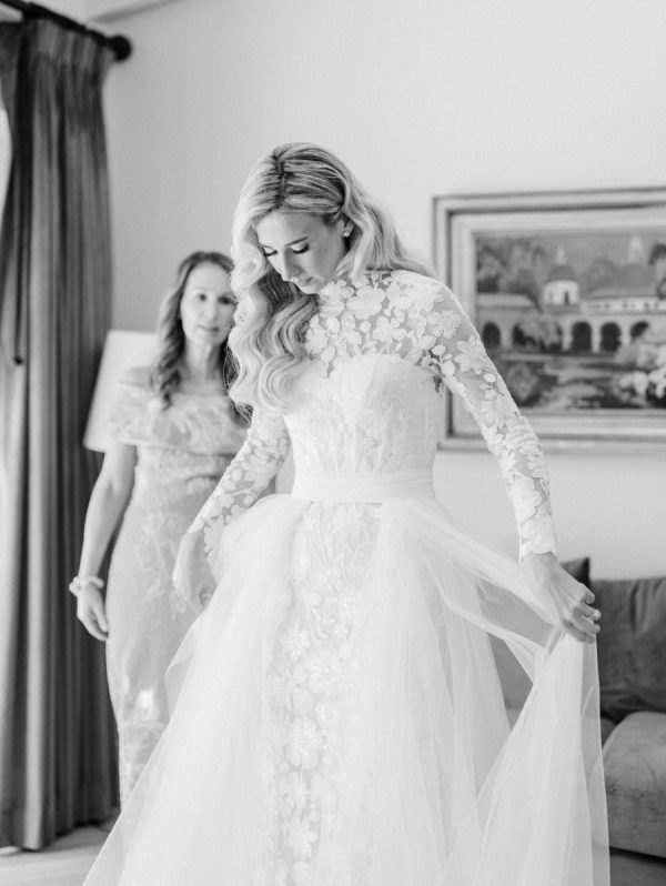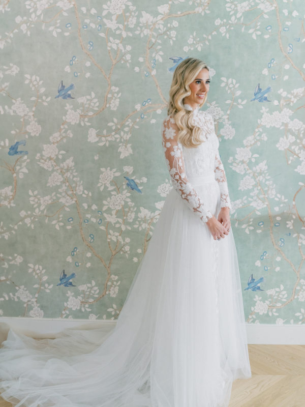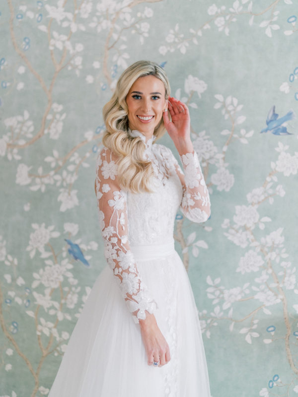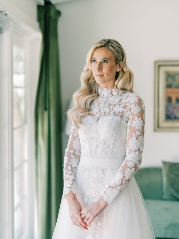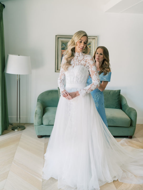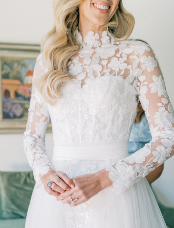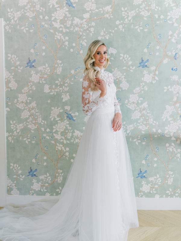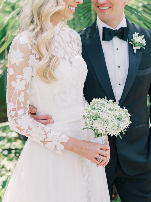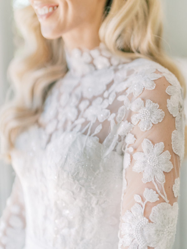 [field title=”Wedding Gown”]Courtney wore the Anne Barge Solana dress which features a delicate overlay of lace, a high neckline and sleeves. For the first part of the day she used a removable overskirt that flowed effortlessly into a sweeping train making it the perfect addition to that dress. [/field]