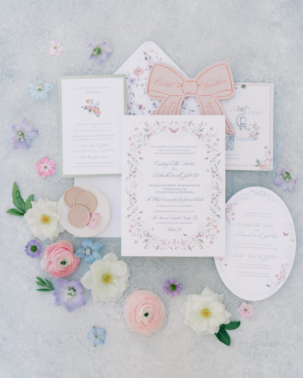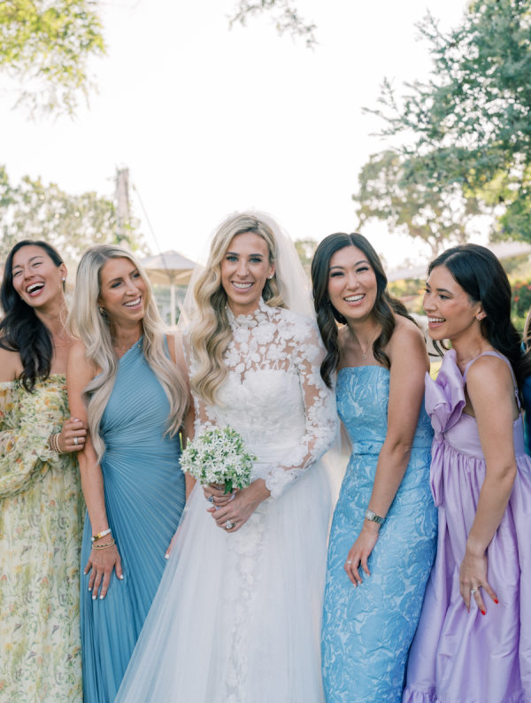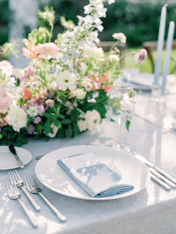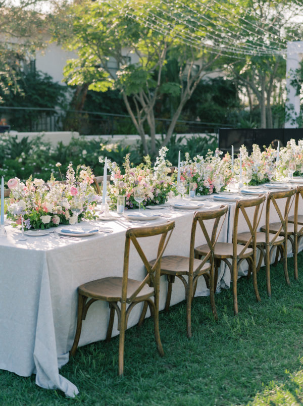[field title=”Florals & Decor”]The floral design by Carla Kayes was a dreamy symphony of soft pastels and lush blooms, creating a garden-inspired elegance that perfectly complemented their outdoor celebration. Delicate roses, ranunculus, lisianthus, and wildflowers in shades of blush, cream, lavender, and peach adorned the tables, arranged in organic, overflowing centerpieces that felt both romantic and effortless. The arrangements beautifully framed the dinner tables, enhancing the ambiance with their natural beauty and charm, making every guest feel like they were dining in an enchanted garden.[/field]