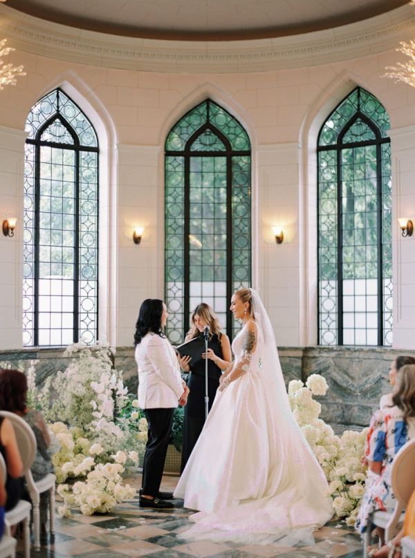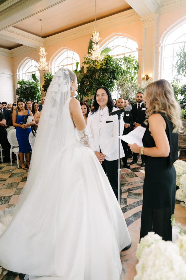 It was really important to Vanessa that the first time the couple saw each other was at the altar, so we carefully strategized to make sure they had the big reveal they dreamed of when Celina walked down the aisle with her parents. The couple’s ceremony included readings and affirmations of LGBTQ2S+ love, and they honoured their moms by having them sign the marriage license with them while “My Girl” and “Always Be My Baby” played in the background.