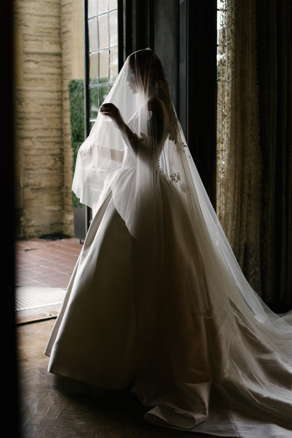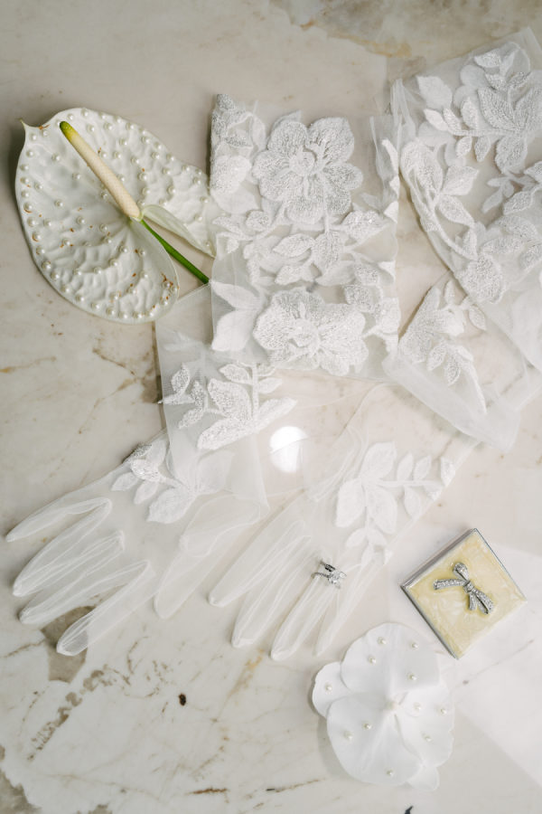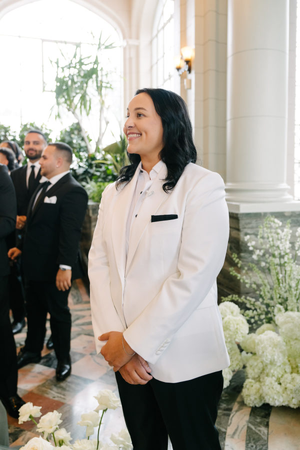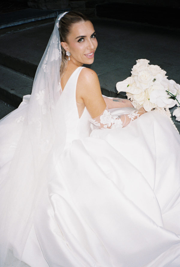 Natasha Morén-Espinozaa ( Custom Suit Clothier at Gotstyle) about Vanessa’s look: When it comes to styling a white dinner jacket, go for a classic black-tie look. A white dress shirt, black satin bow tie, black tuxedo trousers, and black shoes or loafers will make for the perfect foundation. Celina’s wedding dress was a perfect combination of classic, timeless, and dramatic look with a modern twist.