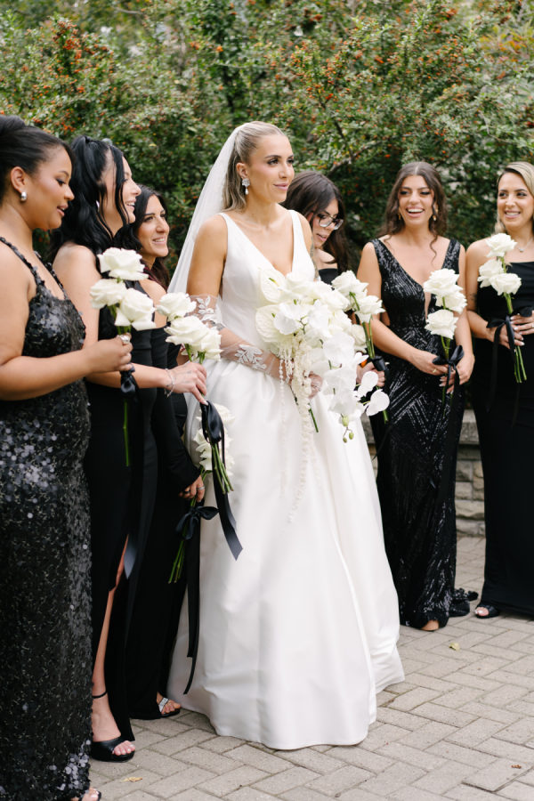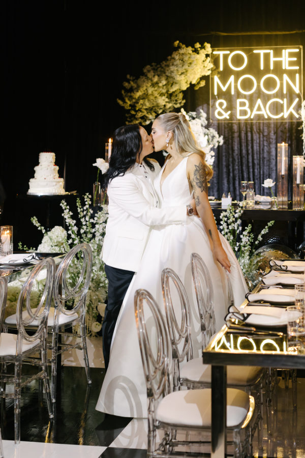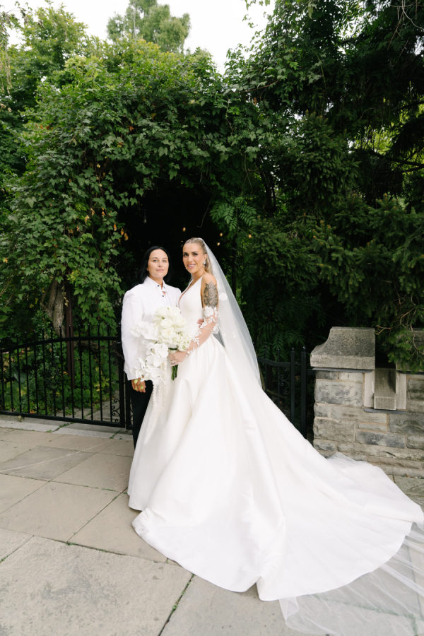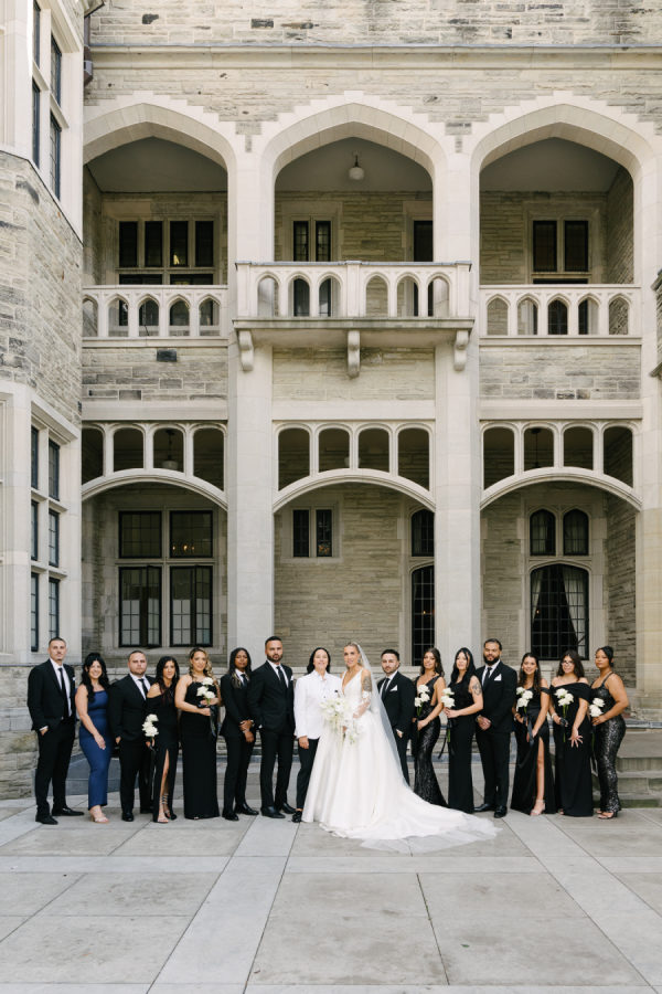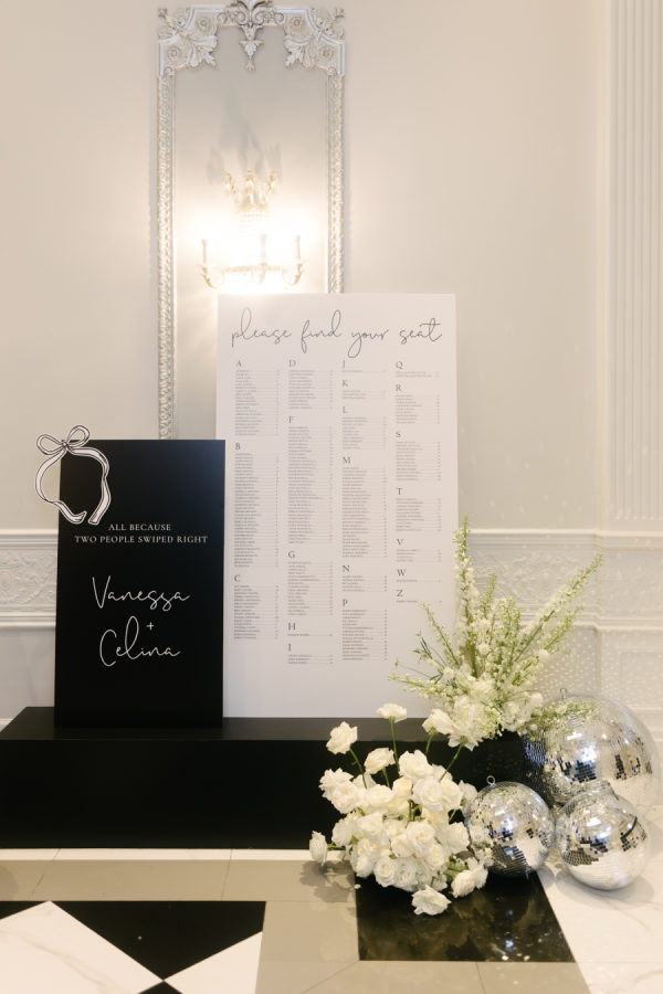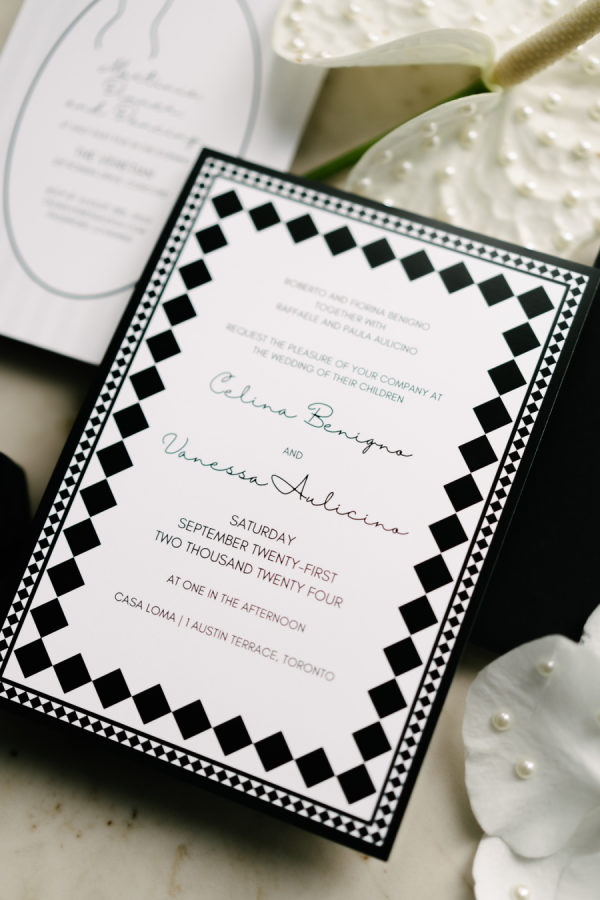 (In the words of Valary Chrisman, planner and designer, Vivid & Vogue) I met Celina when we were working together on another wedding – she also works in the industry as a hair and makeup artist. Knowing that she was so in tune with vendors and trends and chose me to help with her wedding was a huge honour! We knew we wanted to embrace some of the more classic elements of the ceremony and reception spaces, and the timeless elegance of a black and white palette – but with lots of modern touches that were playful and fun. For the ceremony at Casa Loma, we went super romantic with lots of white flowers to wrap around the couple like a lovely cocoon of beauty that reflected the love and support of everyone present. We wanted to make sure the floral would be able to be reused for the reception, so Maria from Narcissus and Echo designed the pieces to be modular, and these pieces were used to surround the sweetheart table at the reception. For the reception at the Venetian, we wanted something that felt a bit more sexy and moody than the traditional banquet hall decor, so when Celina suggested draping the entire space in black velvet, it felt like the perfect way to create that atmosphere. One of the DJs said it felt like a Miami nightclub, and I think he nailed it with that description! The reception was a perfect mix of beautiful and luxurious, mixed with playful touches through the scalloped-edge napkins, disco balls, and the cherry-covered wedding cake. The Details I love pattern and texture play, especially when working with a minimal colour palette – we brought in a variety of rich textures between the drapes, the ribbed glass elements on some of the candleholders, the linen napkins and textured tablecloths from Table Tales, and the variety of white flowers from Narcissus and Echo that added lots of depth and dimension. Pattern play was also a feature of the design, mixing stripes, scallops, grids, and wavy elements to make everything a bit more whimsical while keeping the palette restrained. While I did most of the stationery design myself including the Save the Dates, invitations, and website, we had a few specialty vendors come in for the day-of items, including the seating chart by Prete Prints, the menus by Maddieolamade, and the custom cocktail napkins with Copper’s face on them which were made by a designer on Etsy. The couple’s dog, Copper, certainly stole the show during getting ready photos and the ceremony – there were so many of us taking photos of him that one of my team called us the “copperatzi”. While he couldn’t attend the reception, he was there in spirit for the whole night, and featured on the cocktail napkins at the custom martini bar. The couple loves martinis, so of course, we had to devote a whole bar to them as a welcome drink. The martini bar and other custom black and white furniture brought in from Detailz added yet another element of texture play in a mix of ribbed wood and mirrored finishes. You’ll notice quite a few mirror elements in the wedding – Celina made the mirrored table numbers herself with the help of her father, who sourced the tile. We also, of course, had lots of mirrored disco balls scattered throughout the space for that party vibe! Traditions and New Traditions. It was really important to Vanessa that the first time the couple saw each other was at the altar, so we carefully strategized to make sure they had the big reveal they dreamed of when Celina walked down the aisle with her parents. The couple’s ceremony included readings and affirmations of LGBTQ2S+ love, and they honoured their moms by having them sign the marriage license with them while “My Girl” and “Always Be My Baby” played in the background. The reception featured a classic Italian antipasto table and meal, but Celina and Vanessa didn’t just stick with the classics here – for late night, they did a mix of aglio e olio pasta station, McDonald’s, and Krispy Kreme donuts, along with their modern vintage wedding cake from Make Kwento. One more new tradition they added was tooth gems – guests could get a small rhinestone embellishment as a semi-permanent extra sparkle to their style as part of the late-night entertainment. The brides, of course, got theirs done to match each other.