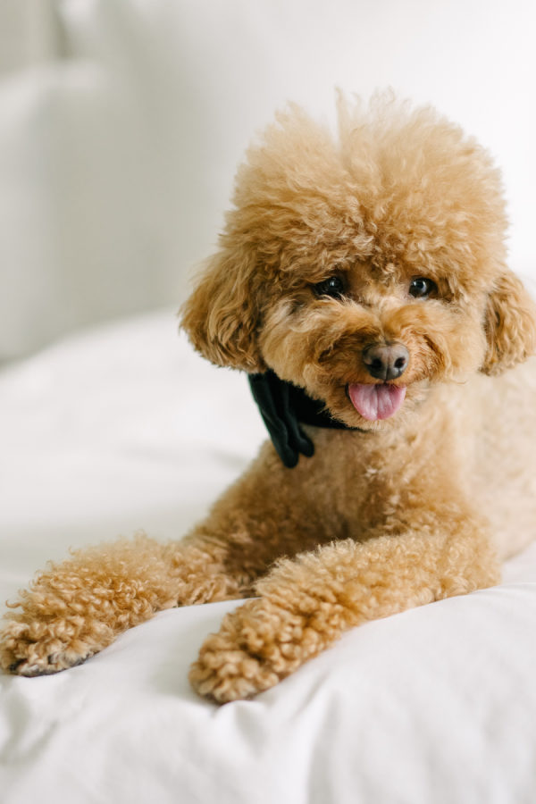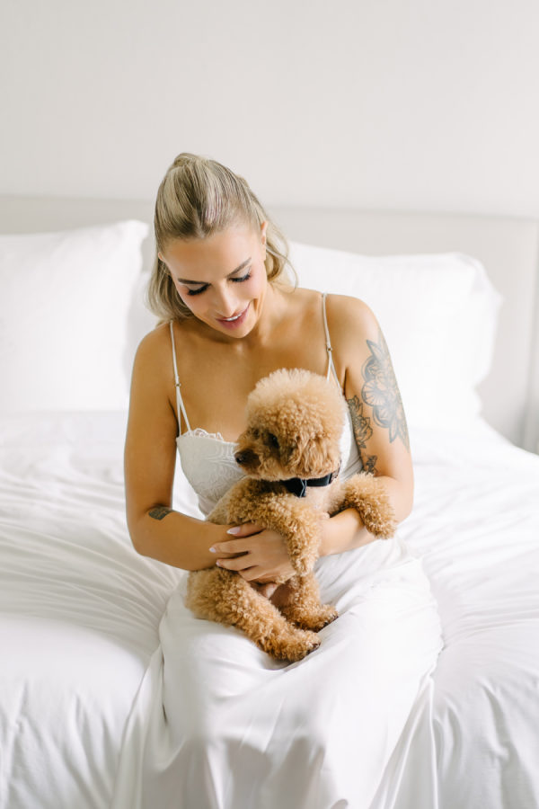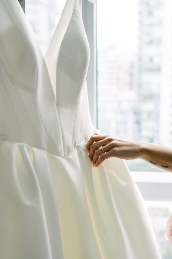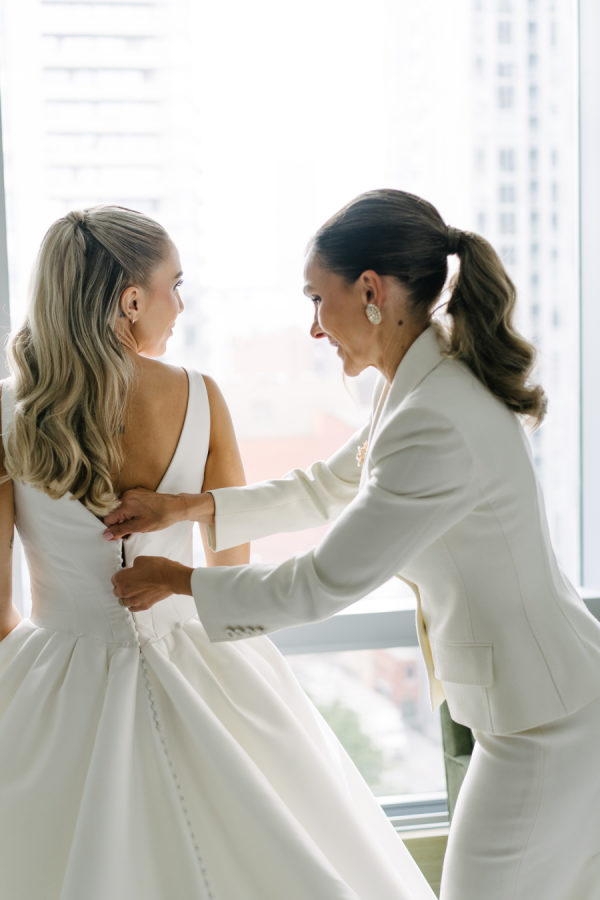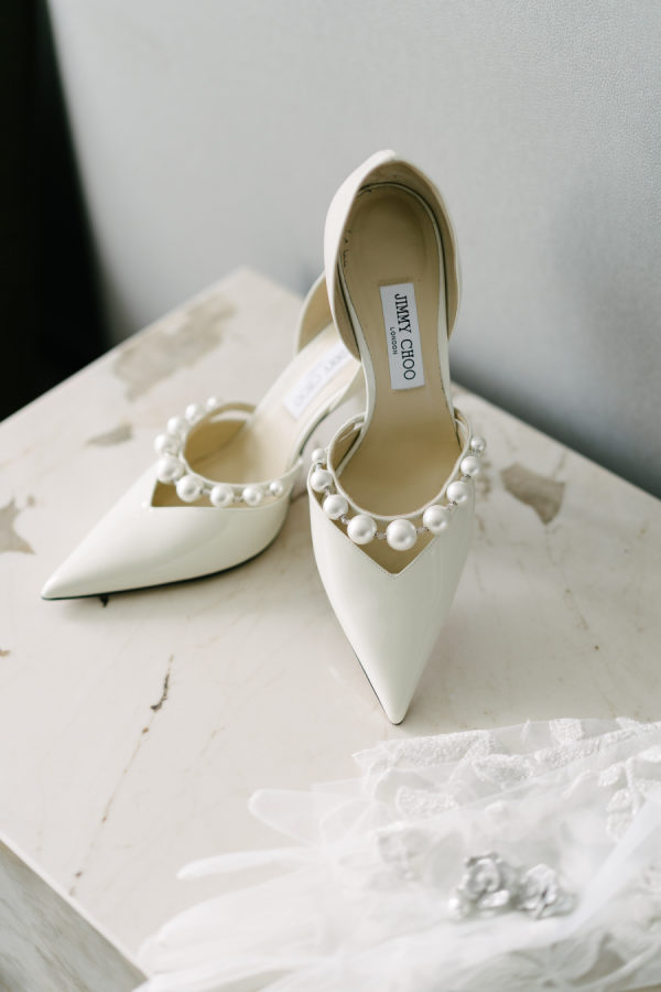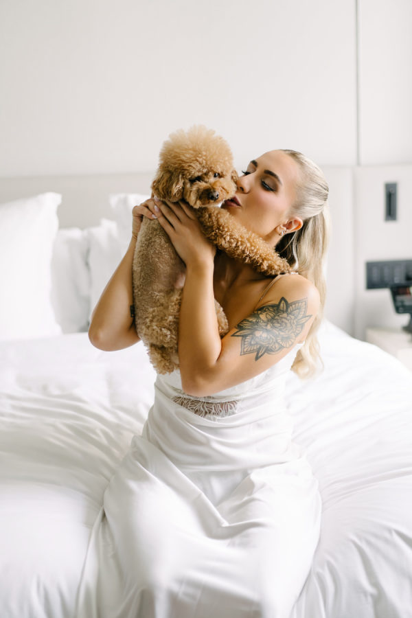 (In the words of Valary Chrisman, planner and designer, Vivid & Vogue) I met Celina when we were working together on another wedding – she also works in the industry as a hair and makeup artist. Knowing that she was so in tune with vendors and trends and chose me to help with her wedding was a huge honour! We knew we wanted to embrace some of the more classic elements of the ceremony and reception spaces, and the timeless elegance of a black and white palette – but with lots of modern touches that were playful and fun. For the ceremony at Casa Loma, we went super romantic with lots of white flowers to wrap around the couple like a lovely cocoon of beauty that reflected the love and support of everyone present. We wanted to make sure the floral would be able to be reused for the reception, so Maria from Narcissus and Echo designed the pieces to be modular, and these pieces were used to surround the sweetheart table at the reception. For the reception at the Venetian, we wanted something that felt a bit more sexy and moody than the traditional banquet hall decor, so when Celina suggested draping the entire space in black velvet, it felt like the perfect way to create that atmosphere. One of the DJs said it felt like a Miami nightclub, and I think he nailed it with that description! The reception was a perfect mix of beautiful and luxurious, mixed with playful touches through the scalloped-edge napkins, disco balls, and the cherry-covered wedding cake. The Details I love pattern and texture play, especially when working with a minimal colour palette – we brought in a variety of rich textures between the drapes, the ribbed glass elements on some of the candleholders, the linen napkins and textured tablecloths from Table Tales, and the variety of white flowers from Narcissus and Echo that added lots of depth and dimension. Pattern play was also a feature of the design, mixing stripes, scallops, grids, and wavy elements to make everything a bit more whimsical while keeping the palette restrained. While I did most of the stationery design myself including the Save the Dates, invitations, and website, we had a few specialty vendors come in for the day-of items, including the seating chart by Prete Prints, the menus by Maddieolamade, and the custom cocktail napkins with Copper’s face on them which were made by a designer on Etsy. The couple’s dog, Copper, certainly stole the show during getting ready photos and the ceremony – there were so many of us taking photos of him that one of my team called us the “copperatzi”. While he couldn’t attend the reception, he was there in spirit for the whole night, and featured on the cocktail napkins at the custom martini bar. The couple loves martinis, so of course, we had to devote a whole bar to them as a welcome drink. The martini bar and other custom black and white furniture brought in from Detailz added yet another element of texture play in a mix of ribbed wood and mirrored finishes. You’ll notice quite a few mirror elements in the wedding – Celina made the mirrored table numbers herself with the help of her father, who sourced the tile. We also, of course, had lots of mirrored disco balls scattered throughout the space for that party vibe! Traditions and New Traditions. It was really important to Vanessa that the first time the couple saw each other was at the altar, so we carefully strategized to make sure they had the big reveal they dreamed of when Celina walked down the aisle with her parents. The couple’s ceremony included readings and affirmations of LGBTQ2S+ love, and they honoured their moms by having them sign the marriage license with them while “My Girl” and “Always Be My Baby” played in the background. The reception featured a classic Italian antipasto table and meal, but Celina and Vanessa didn’t just stick with the classics here – for late night, they did a mix of aglio e olio pasta station, McDonald’s, and Krispy Kreme donuts, along with their modern vintage wedding cake from Make Kwento. One more new tradition they added was tooth gems – guests could get a small rhinestone embellishment as a semi-permanent extra sparkle to their style as part of the late-night entertainment. The brides, of course, got theirs done to match each other.