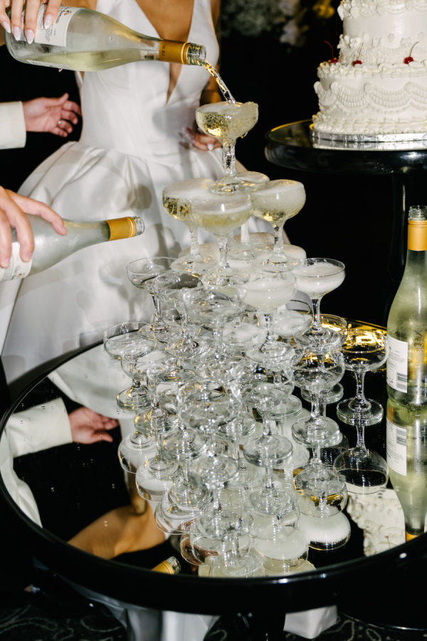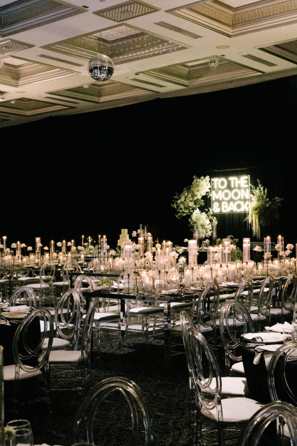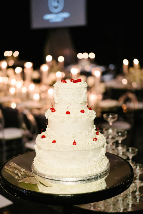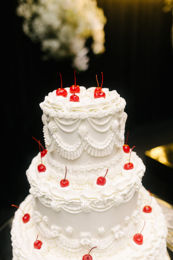 For the ceremony at Casa Loma, we went super romantic with lots of white flowers to wrap around the couple like a lovely cocoon of beauty that reflected the love and support of everyone present. We wanted to make sure the floral would be able to be reused for the reception, so Maria from Narcissus and Echo designed the pieces to be modular, and these pieces were used to surround the sweetheart table at the reception. For the reception at the Venetian, we wanted something that felt a bit more sexy and moody than the traditional banquet hall decor, so when Celina suggested draping the entire space in black velvet, it felt like the perfect way to create that atmosphere. One of the DJs said it felt like a Miami nightclub, and I think he nailed it with that description! The reception was a perfect mix of beautiful and luxurious, mixed with playful touches through the scalloped-edge napkins, disco balls, and the cherry-covered wedding cake.