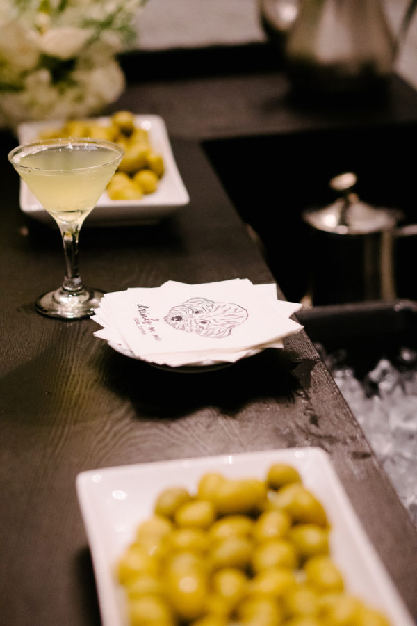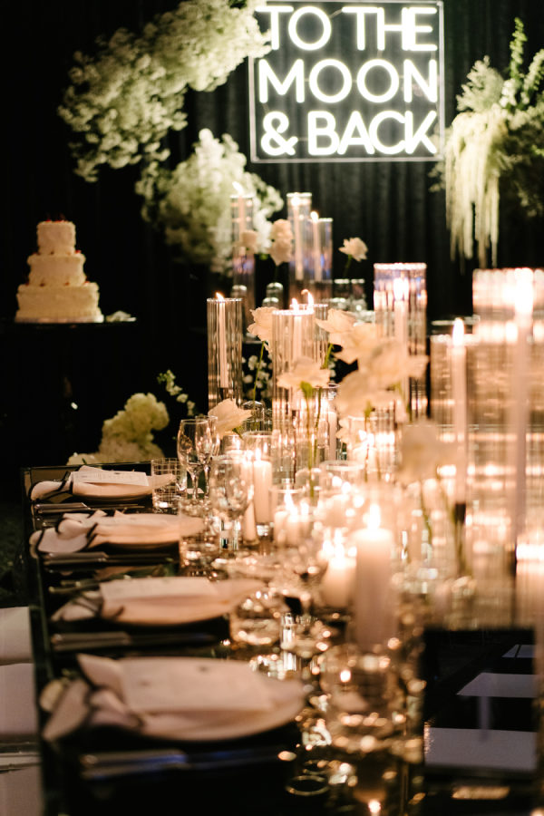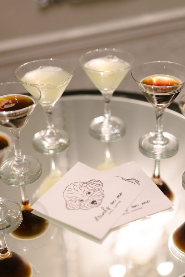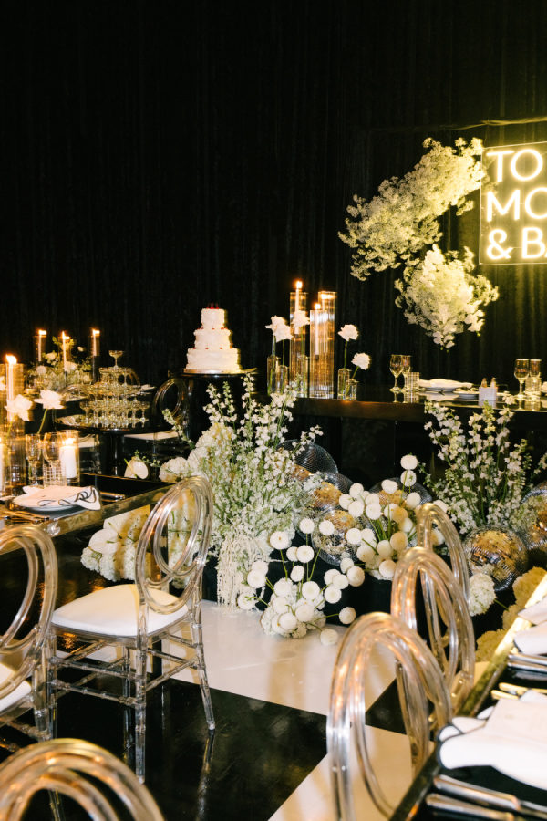 The couple loves martinis, so of course, we had to devote a whole bar to them as a welcome drink. The martini bar and other custom black and white furniture brought in from Detailz added yet another element of texture play in a mix of ribbed wood and mirrored finishes. You’ll notice quite a few mirror elements in the wedding – Celina made the mirrored table numbers herself with the help of her father, who sourced the tile. We also, of course, had lots of mirrored disco balls scattered throughout the space for that party vibe!