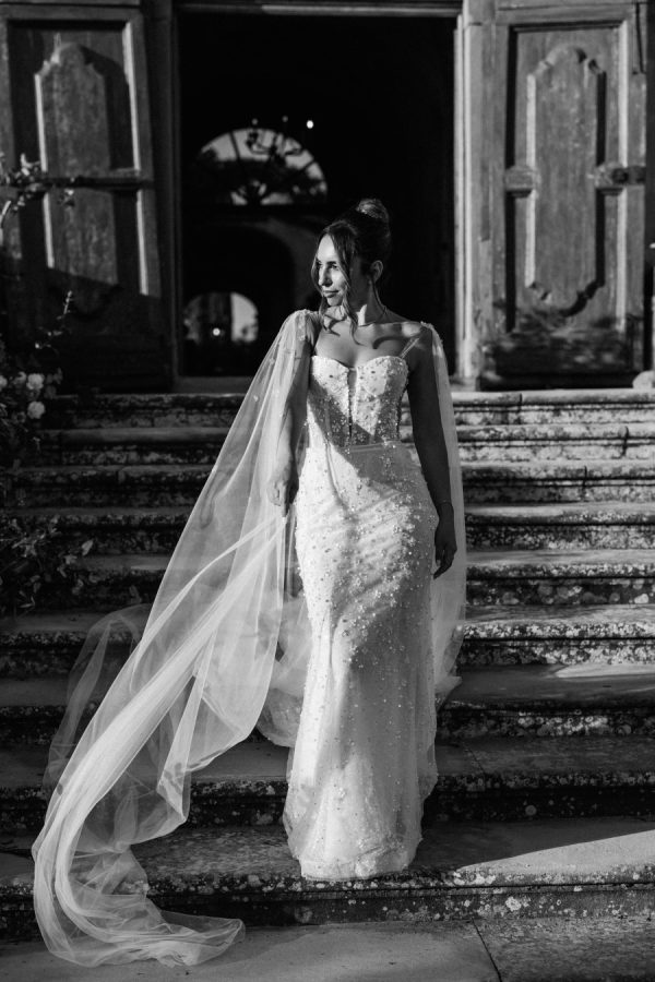 My gown was a custom dress made by Lee Grebenau and Powder Boutique. I had gone to Powder knowing that Lee was having a trunk show; there were 2 gowns that I had seen on her Instagram page from the newest collection that I was dying to “get out of my head”. I only tried on 8 dresses at the boutique, and once I tried on the “Glow” gown, I knew it was the one. We had made modifications to the neckline, and Powder made custom straps and a cape that connected at the back of my dress. I didn’t see myself as a veil person, and thought a cape was a unique and elegant but modern touch to tie the look together.