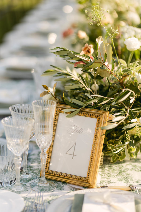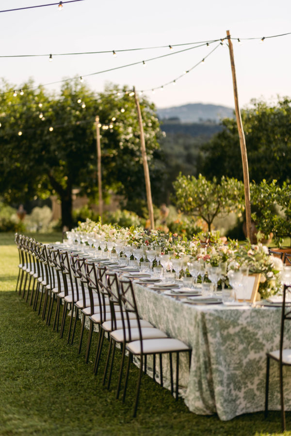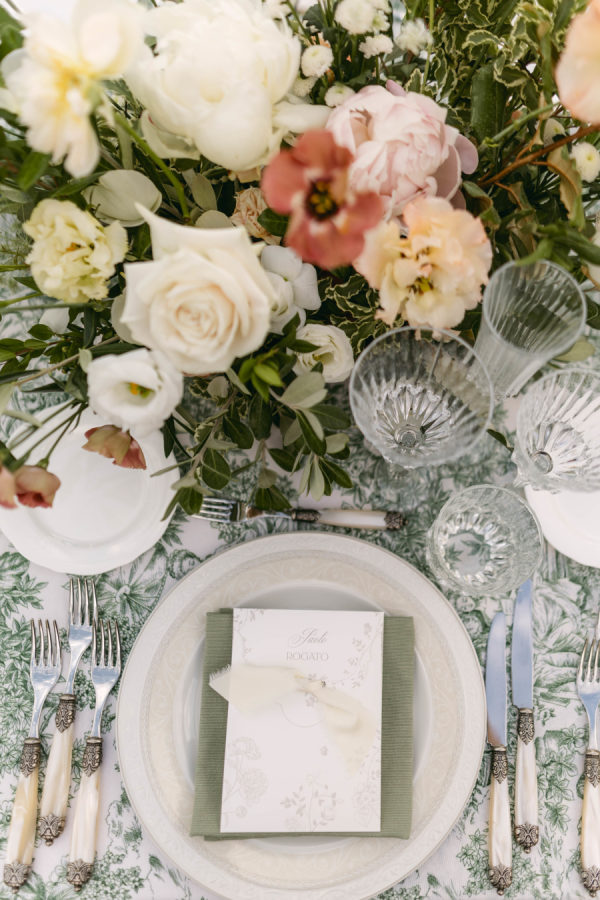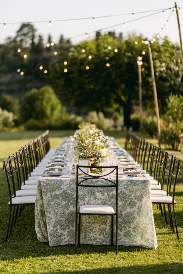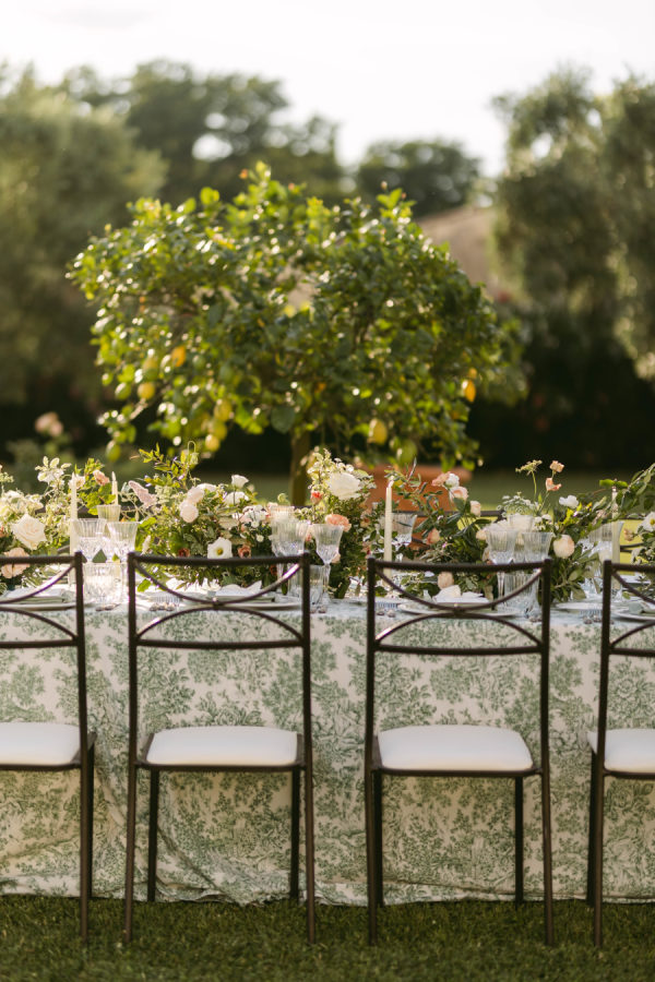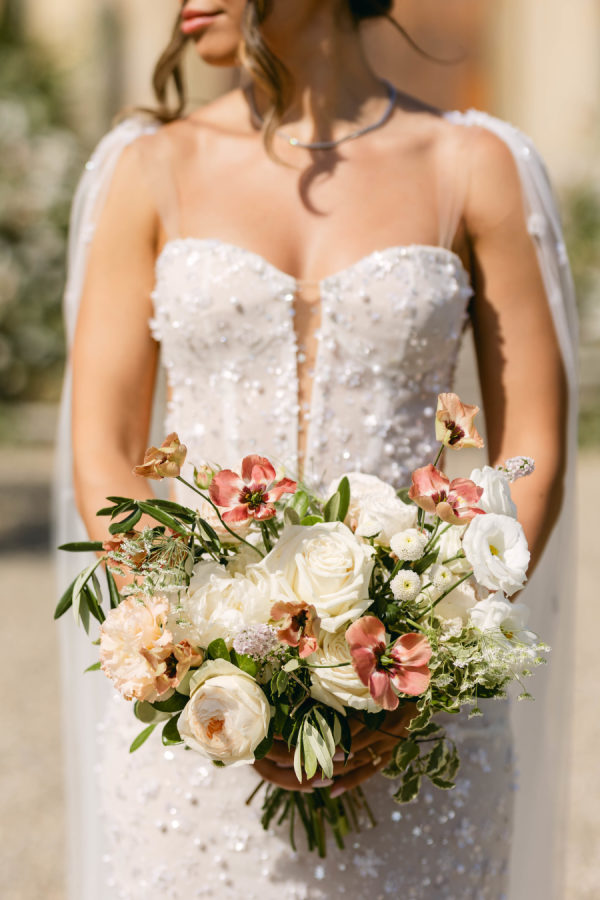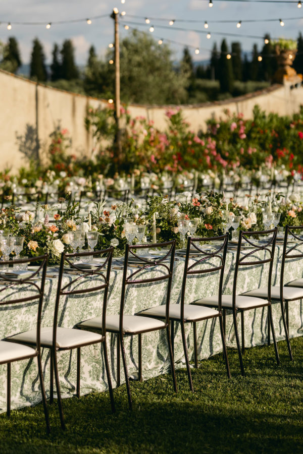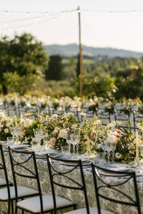 Delicate, locally sourced florals were used throughout Emilia’s design to seamlessly complement the beautiful setting. Varieties such as the Emma Woodhouse garden rose, Playa Blanca roses, blush spray roses, and seasonal peonies created weightiness and anchored the design. Chocolate lisianthus, scabiosa, and white orlaya brought playfulness and movement to the design while local foliages created loose edges to finish it off. The ceremony’s floral structure was created as if growing up the historical stone wall. Loose foliage and an undone floral looped around the front of the fountain and climbed up the wall on either side. The floral tabletop at the reception followed the design of the ceremony, with loose and airy flowers lining the lengths of the tables. Slim candles were used throughout, creating a romantic transition into the evening as the sun sank over the Tuscan horizon.