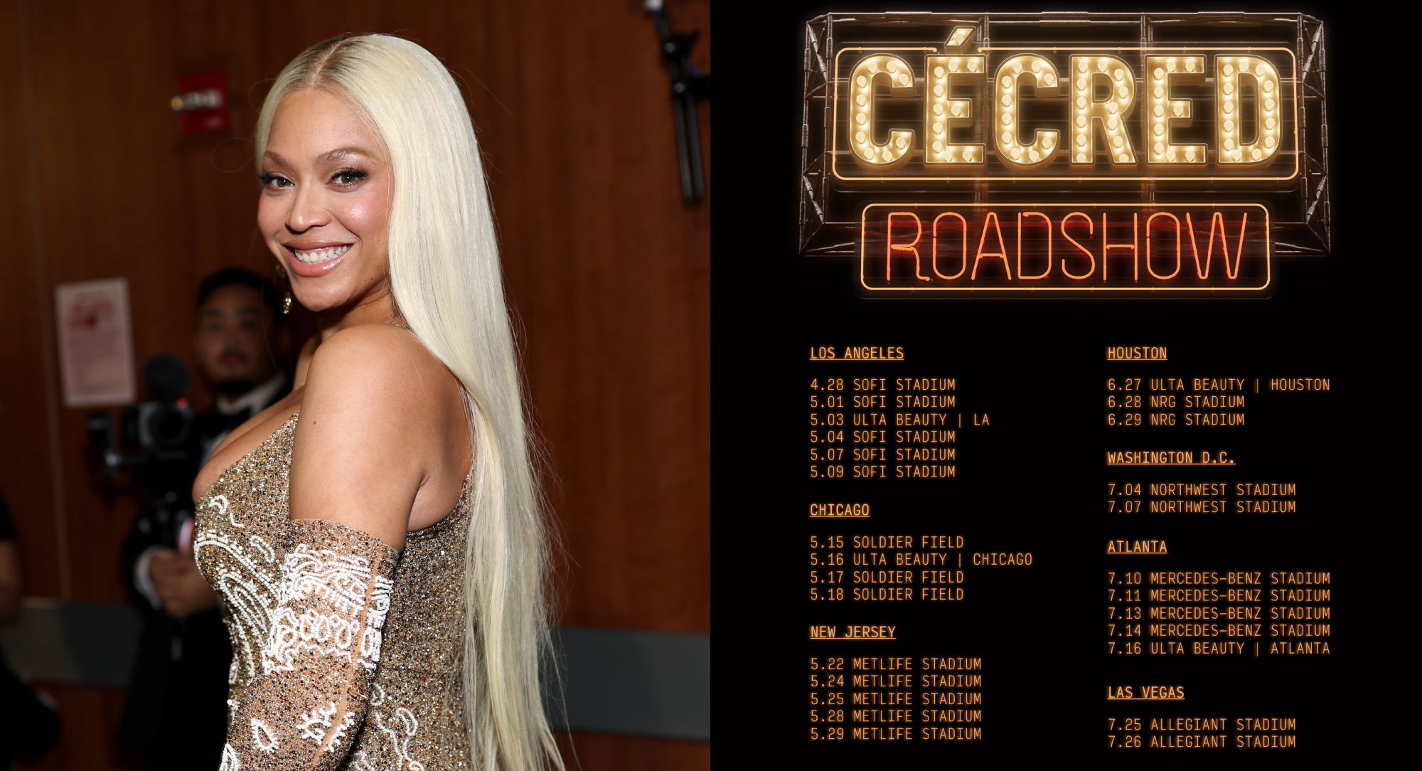 The Cécred Roadshow will debut on April 28 along with Knowles’ Cowboy Carter Tour at the SoFi Stadium in Inglewood, Calif. The series will travel to all seven cities included in the first leg of the tour, including Chicago, New Jersey, Houston, Washington D.C., Atlanta and Las Vegas.