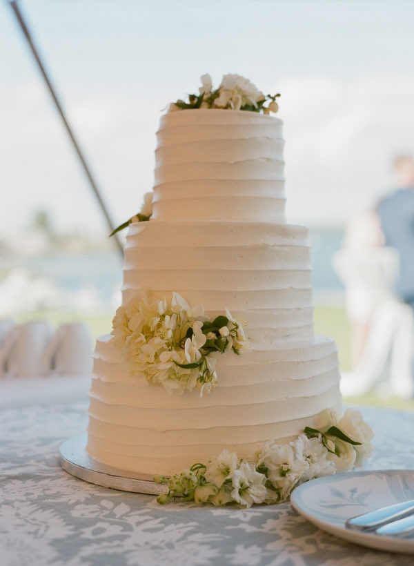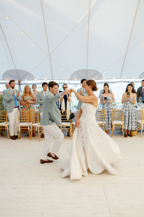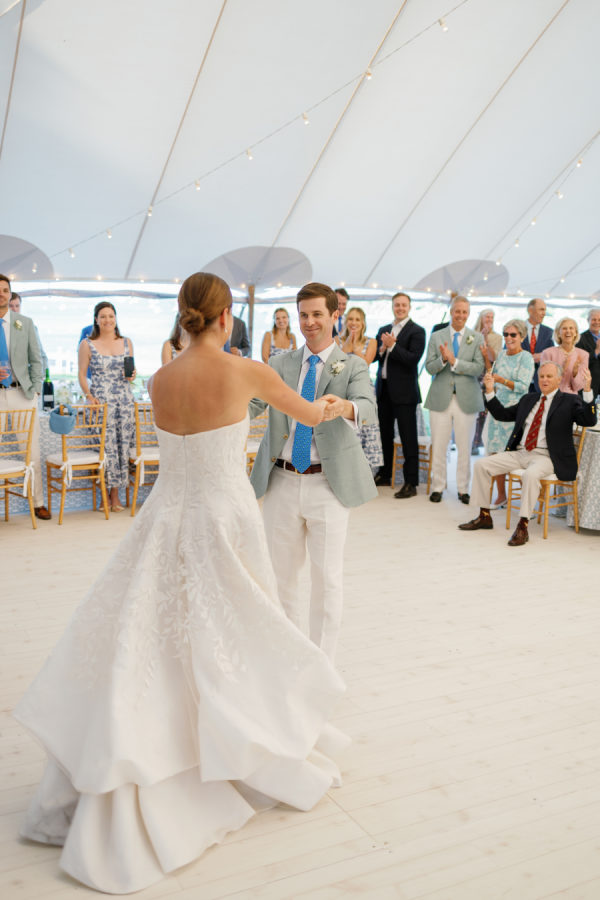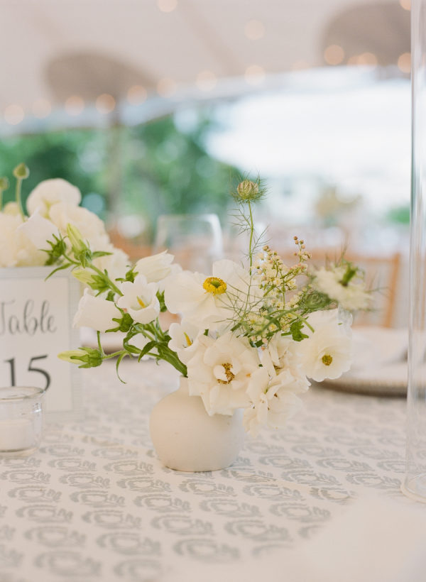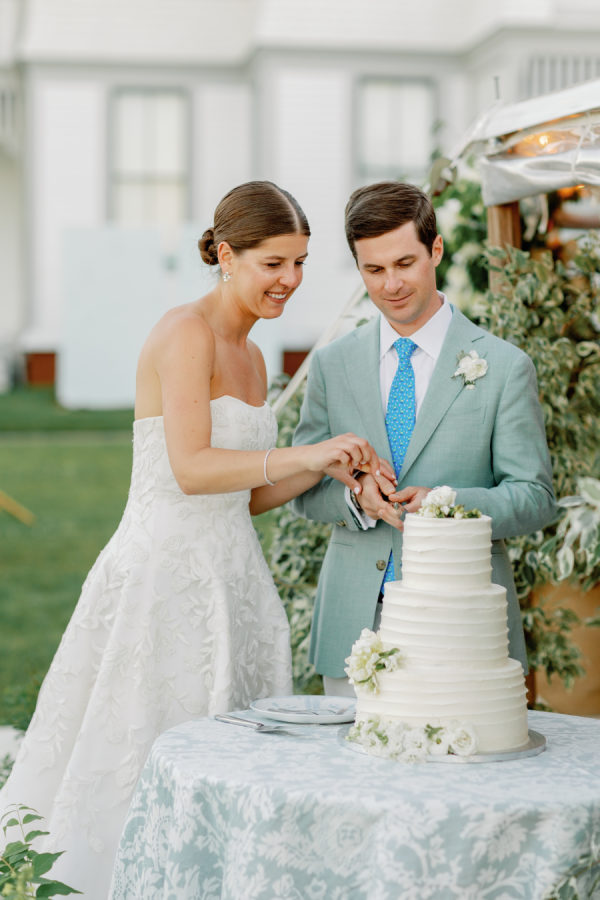 Kristin & Mac chose a simple white cake adorned with vineyard flowers to further embrace the authentic Vineyard feel. Sandy Brooks at Timeless Event Planning is passionate about repurposing flowers to craft stunning settings with carefully curated arrangements for her clients. One of her favorite touches is positioning the cake-cutting table at the tent entrance, framed by lush flowers and greenery. This setup not only creates a beautiful photo backdrop but also serves as a memorable focal point for guests during the cake cutting.