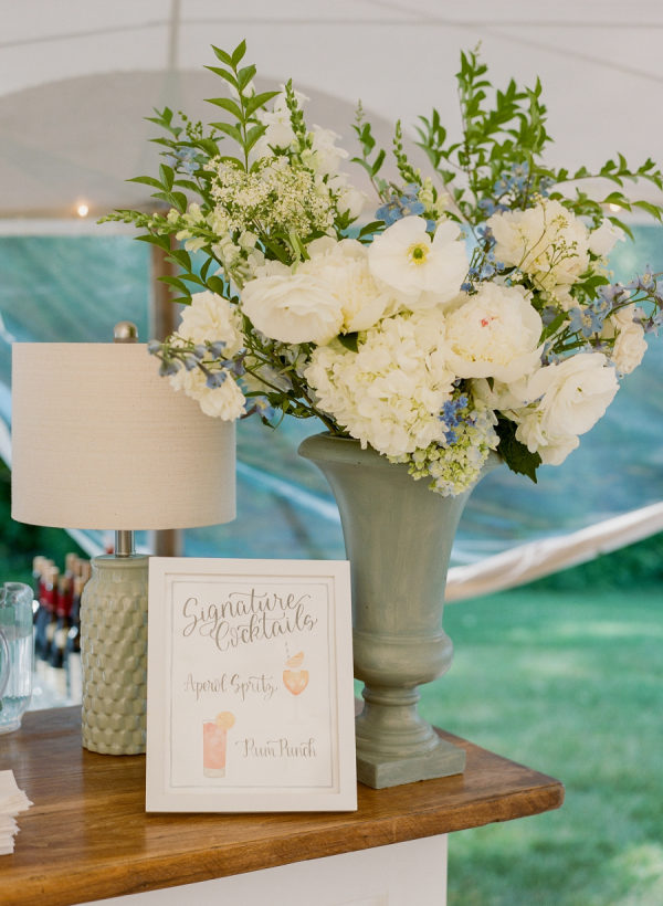 Kristin & Mac chose flowers commonly found around the island, like white hydrangeas and roses, to create an authentic Vineyard ambiance. Every detail was thoughtfully incorporated to craft the perfect island-inspired wedding experience for their guests. The bride and groom wanted a coastal-inspired detail for the escort card display and used oyster shells with pearls to elegantly guide guests to their seats. Finding the perfect linens was a journey, but the Stradley Davidson collection fit their vision flawlessly, capturing the Vineyard’s light, airy, and preppy vibe. To recreate a cozy, restaurant bar feel, Kristin & Mac added warm lamps and custom decals that made each bar truly unique. As guests entered the tent, they were greeted by a beautiful guestbook setup and a card box with a grand floral arrangement, setting the stage for a memorable evening.