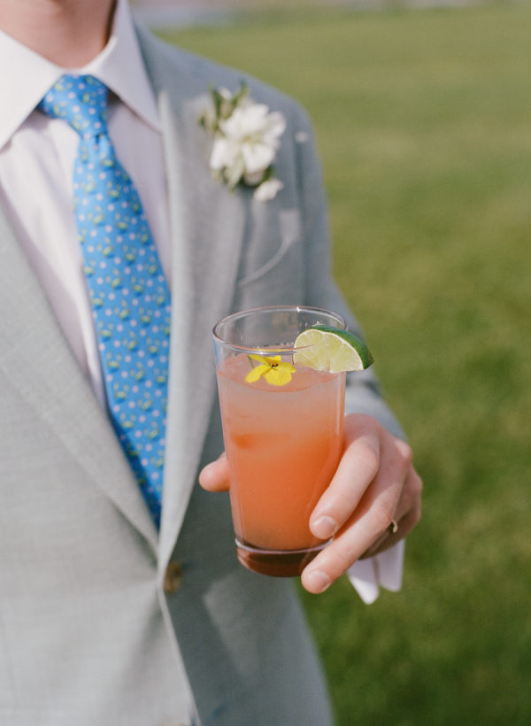 The couple collaborated with Buckley’s Catering, a local vendor on the island known for sourcing ingredients locally. Supporting the island’s economy and embracing fresh, local products was essential to them, adding an authentic Vineyard touch. With so many incredible farms here, crafting a farm-to-table menu felt both natural and meaningful. The cocktail bar overlooked the stunning views of the lagoon and Vineyard Haven Harbor, while the signature cocktails offered vibrant colors reminiscent of a Vineyard sunset, adding a lively pop of color as guests mingled.