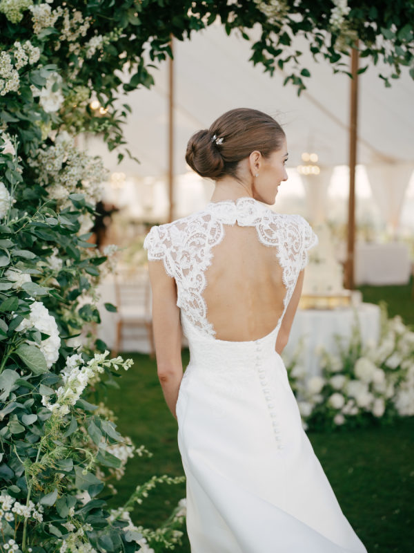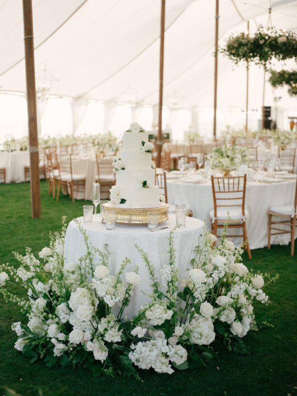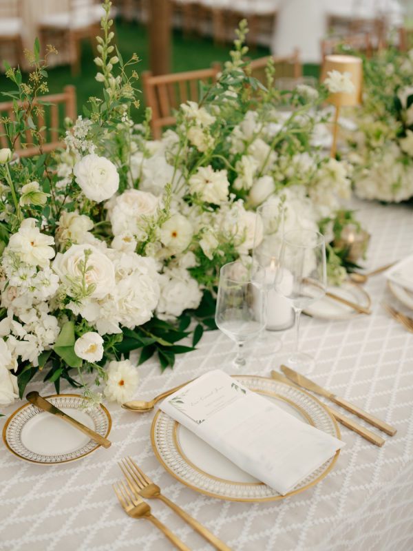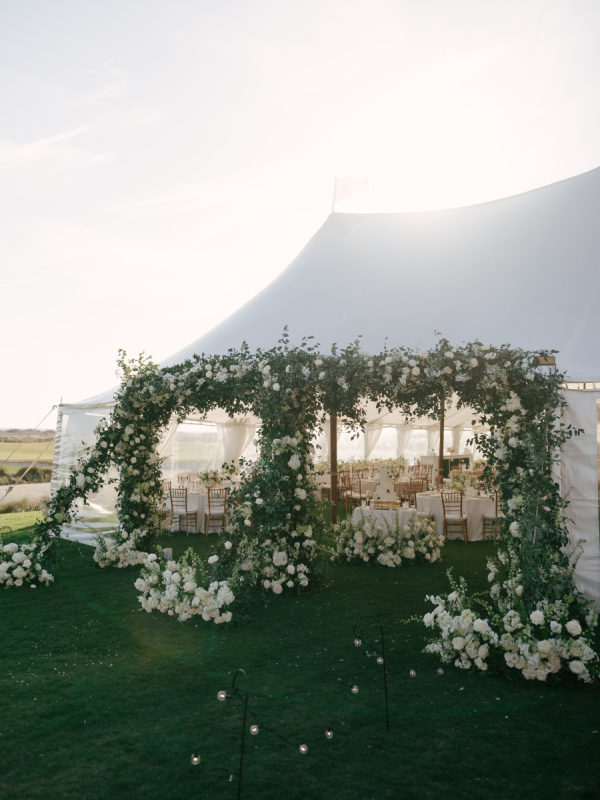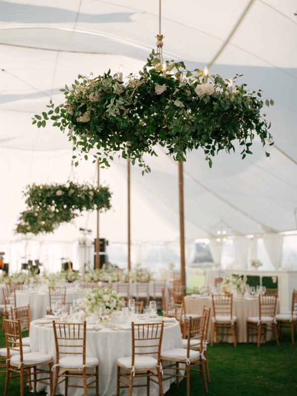 For the ceremony, abundant white hydrangeas and stock created a soft yet structured backdrop. Guests were welcomed into the reception tent through a dramatic, full greenery entrance arch accented with subtle pops of white floral. Inside the tent, greenery-covered chandeliers brought a natural, suspended garden feel overhead.