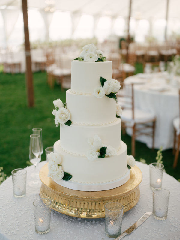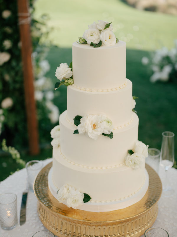 The wedding cake was a stacked 4 tiers with a smooth white finish of buttercream and beading at the base of each tier, decorated with fresh florals. Guests were served both Carrot Cake and Classic Almond Cake.