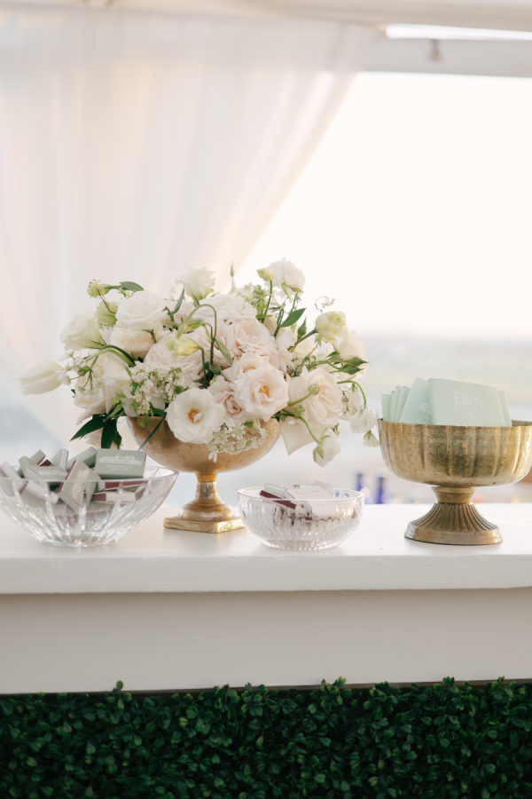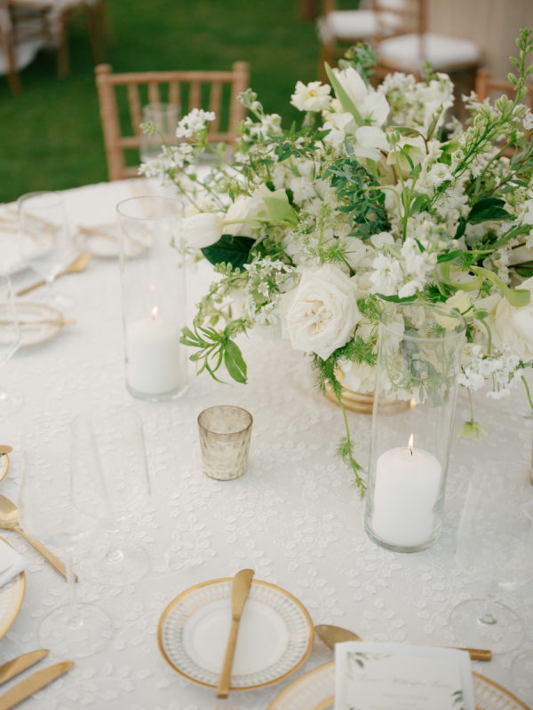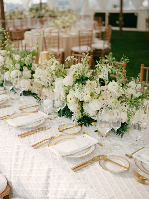 [field title=”Florals & Decor”]The floral vision centered around lush, white-bloom–forward design with an emphasis on texture, movement, and seasonality. The bride and bridesmaids carried full, romantic bouquets composed of white peonies, garden roses, and assorted varieties of ranunculus.