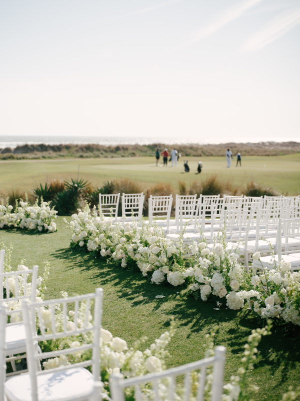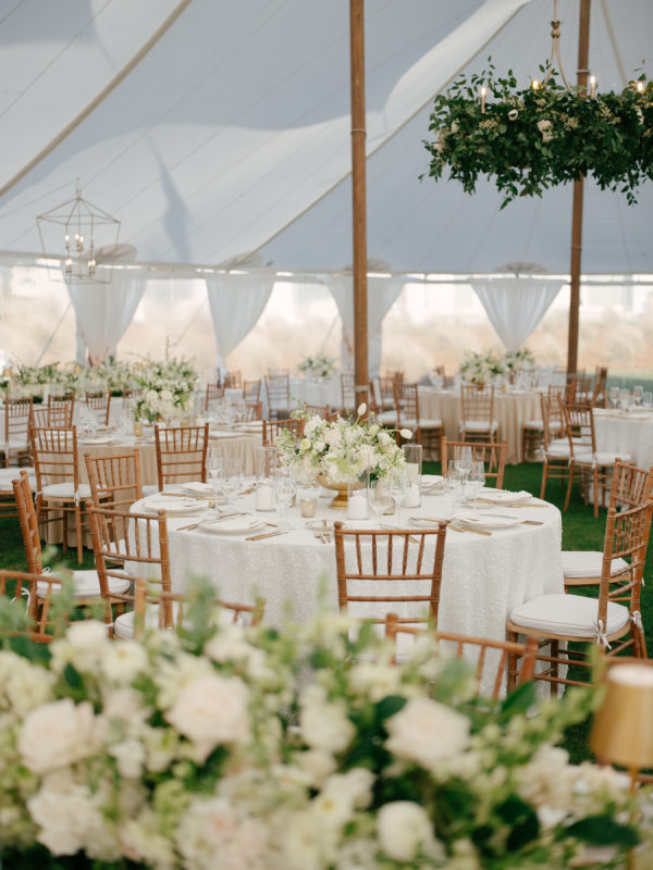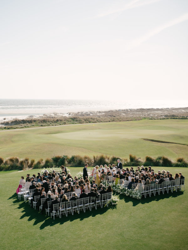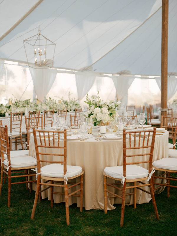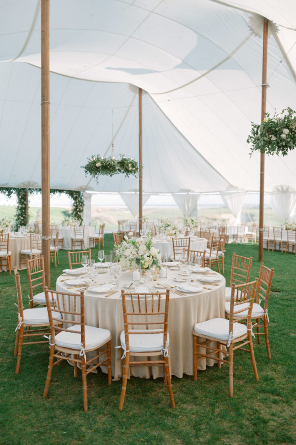 The overall vibe was classy and undeniably timeless. Nothing was too trendy, nothing was overly ornate, but just a beautifully curated blend of traditional Southern charm and elevated coastal sophistication. The day felt fresh, calm, and intentional, with an atmosphere that was both welcoming and polished. The vision was to create a classic spring wedding on Kiawah Island that felt elegant, natural, and true to the couple’s style. They wanted the design to complement the surrounding landscape—rolling greens, ocean breezes, and soft Lowcountry light without overpowering it. The tented celebration was thoughtfully styled to feel romantic, airy, and forever-in-style, with an emphasis on clean design, meaningful details, and a setting that let the natural beauty of the Ocean Course shine.