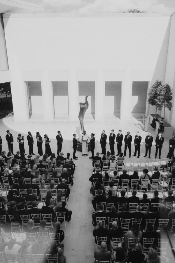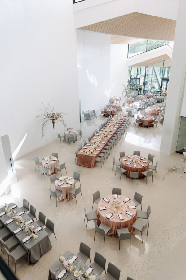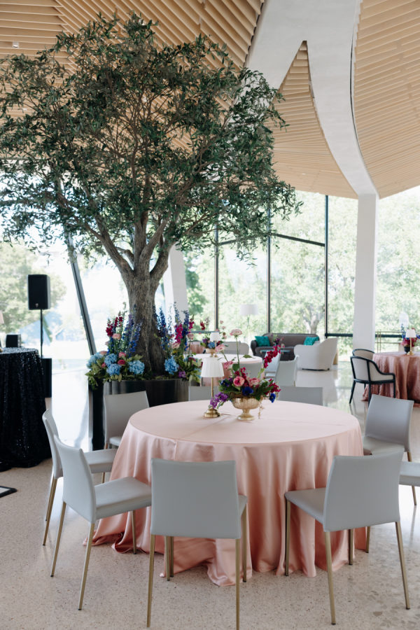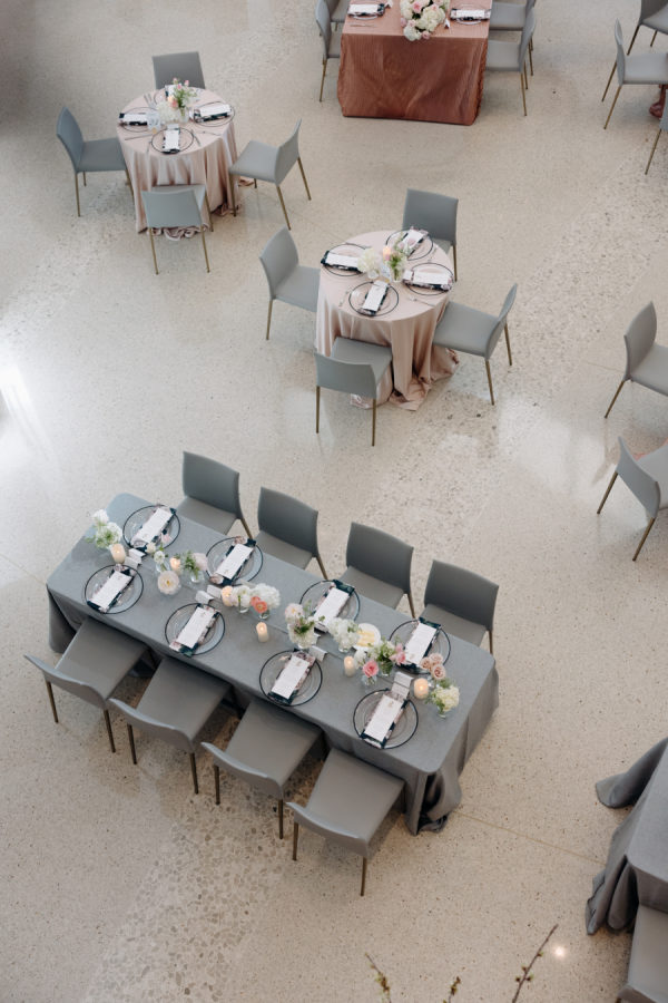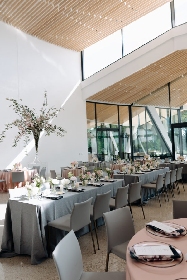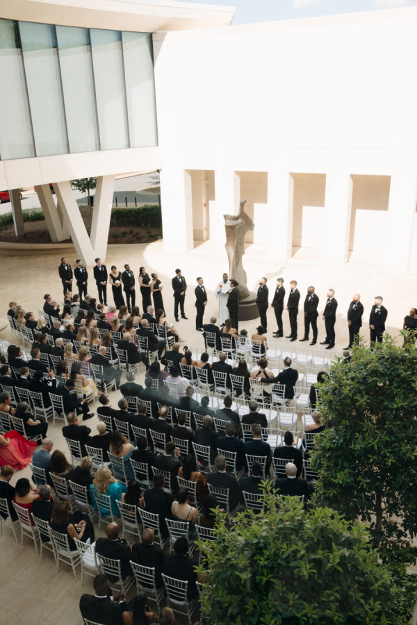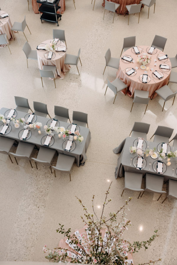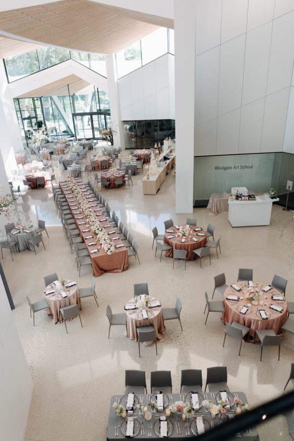 The evening was thoughtfully designed as a layered journey through space, light, and emotion—each transition reflecting a new facet of the couple’s story. Guests were first welcomed into the museum’s open-air courtyard for a heartfelt ceremony, serenaded by a live harpist and violinist—an especially moving detail, as the violinist was Josh’s sister, adding a deeply personal touch to the moment. From there, the celebration moved upstairs to the cultural living room for cocktail hour. This space was transformed into a glitzy, deco-inspired lounge, rich with moody elegance. The color palette—serape rose, teal, black, and sparkle—evoked a sense of old-world glamour with a fresh, modern twist. Guests sipped cocktails while watching the sky soften into sunset through the windows. As the sun dipped, guests were invited downstairs for a seated dinner—a Southern Garden reimagining of the upstairs lounge. The design softened into tones of pinks, blush, gray, black, and serape rose, creating a romantic and grounded atmosphere that brought warmth and intimacy to the evening’s next chapter. Each space was not only visually distinct but emotionally resonant—designed to feel like a progression through the couple’s love story: elegant, personal, and artfully composed.