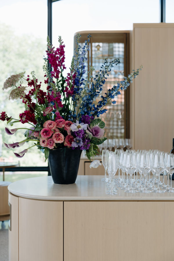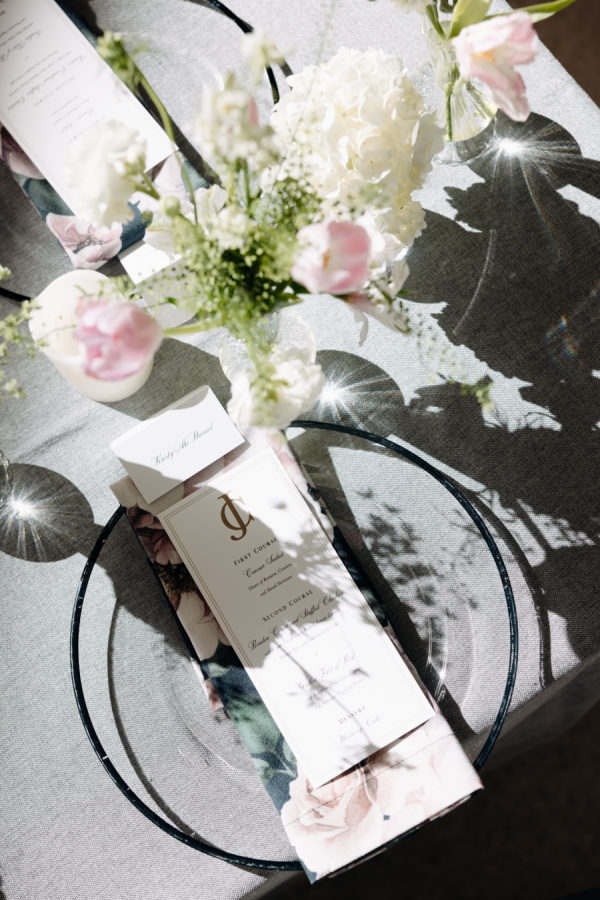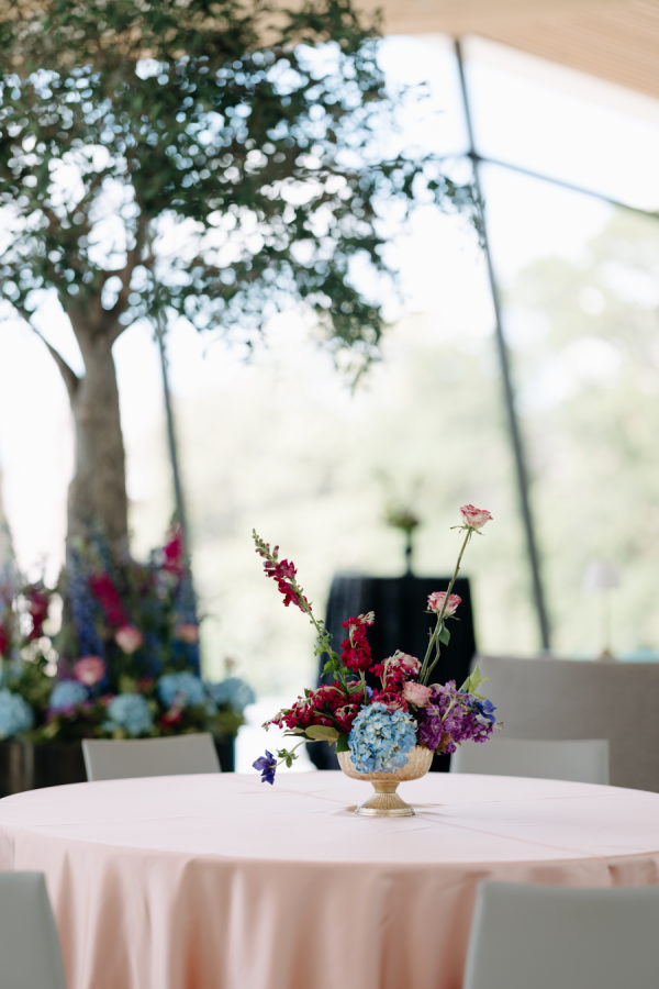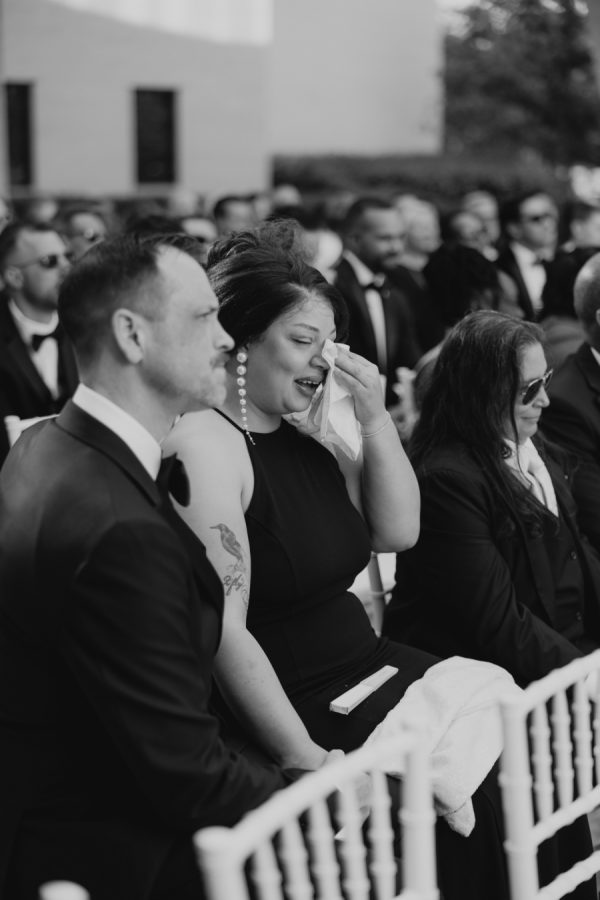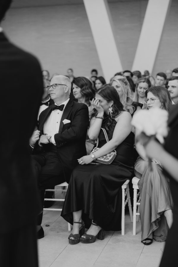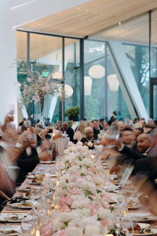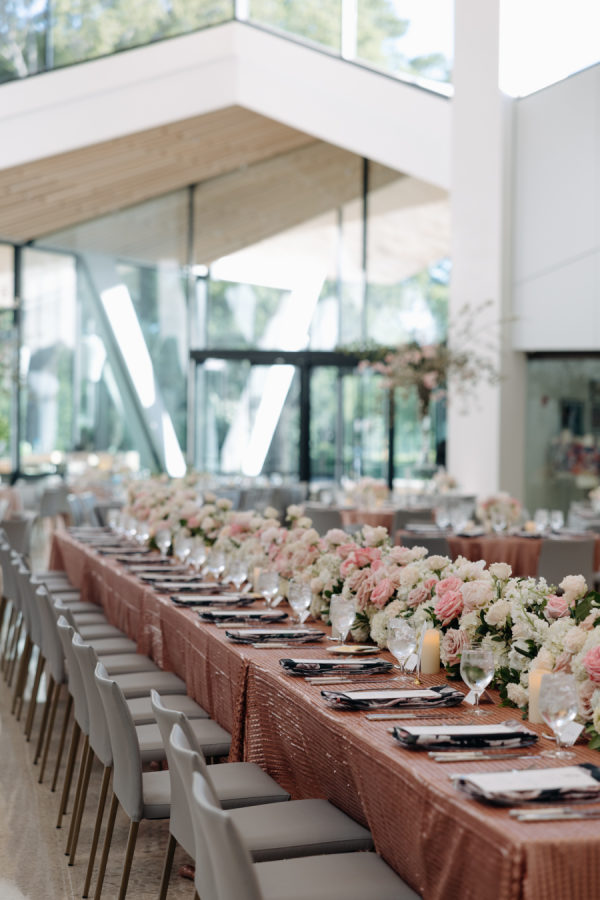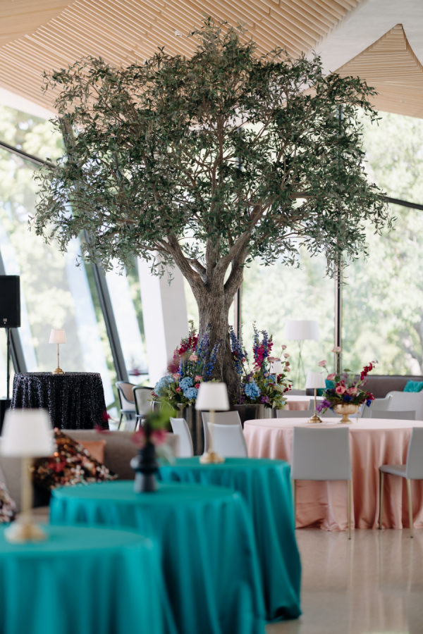 The evening was thoughtfully designed as a layered journey through space, light, and emotion—each transition reflecting a new facet of the couple’s story. Guests were first welcomed into the museum’s open-air courtyard for a heartfelt ceremony, serenaded by a live harpist and violinist—an especially moving detail, as the violinist was Josh’s sister, adding a deeply personal touch to the moment. From there, the celebration moved upstairs to the cultural living room for cocktail hour. This space was transformed into a glitzy, deco-inspired lounge, rich with moody elegance. The color palette—serape rose, teal, black, and sparkle—evoked a sense of old-world glamour with a fresh, modern twist. Guests sipped cocktails while watching the sky soften into sunset through the windows. As the sun dipped, guests were invited downstairs for a seated dinner—a Southern Garden reimagining of the upstairs lounge. The design softened into tones of pinks, blush, gray, black, and serape rose, creating a romantic and grounded atmosphere that brought warmth and intimacy to the evening’s next chapter. Each space was not only visually distinct but emotionally resonant—designed to feel like a progression through the couple’s love story: elegant, personal, and artfully composed.