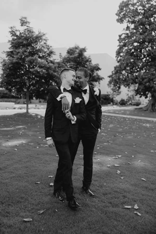 The grooms wore impeccably tailored suits, each paired with custom dress shirts embroidered with their personal signatures on the left sleeve—a subtle, stylish detail that made their fashion deeply personal and uniquely theirs.