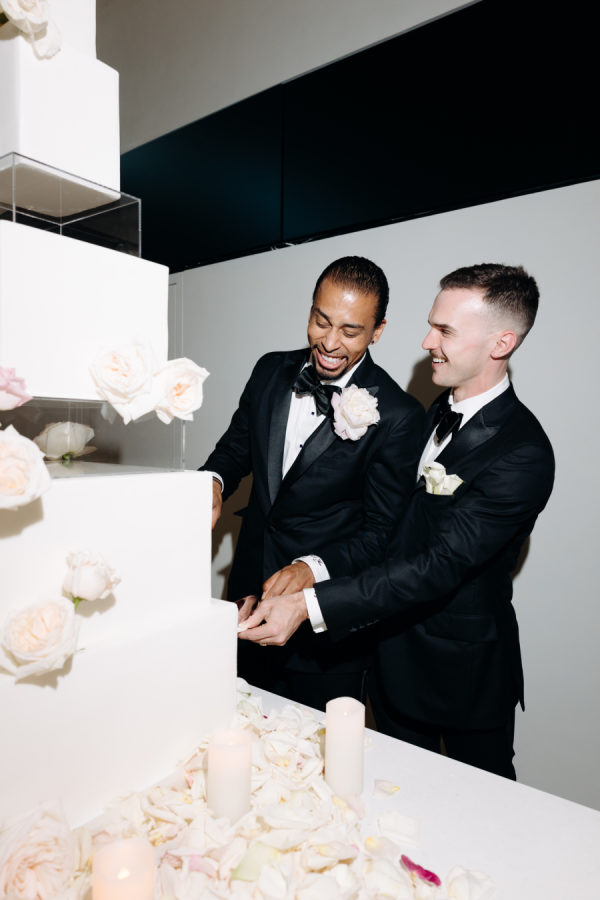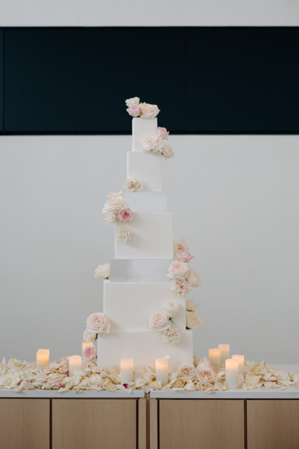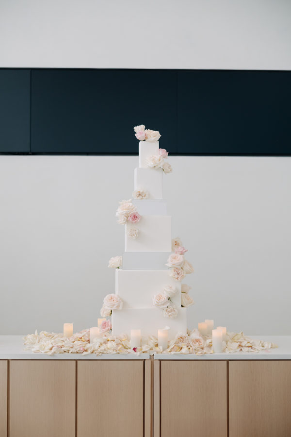 This modern statement cake was as much a piece of art as it was a dessert. Designed with clean, architectural lines, the multi-tiered confection featured alternating solid and clear layers, creating a striking sense of height and dimension. Soft blush and ivory roses cascaded down the front, adding a romantic contrast to the sleek white structure. The base was adorned with scattered rose petals and glowing candles, creating a dreamy vignette that felt both elevated and effortless—perfectly in tune with the couple’s refined, romantic aesthetic.