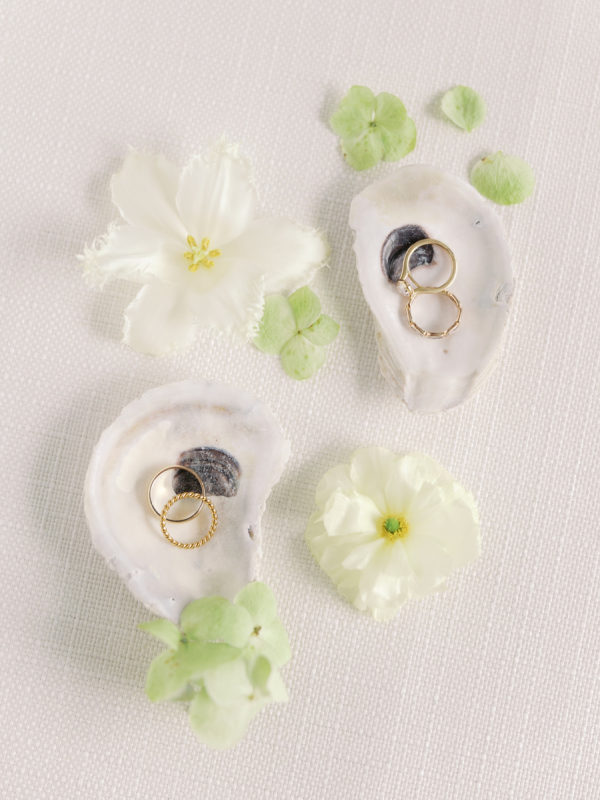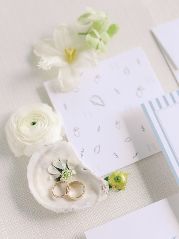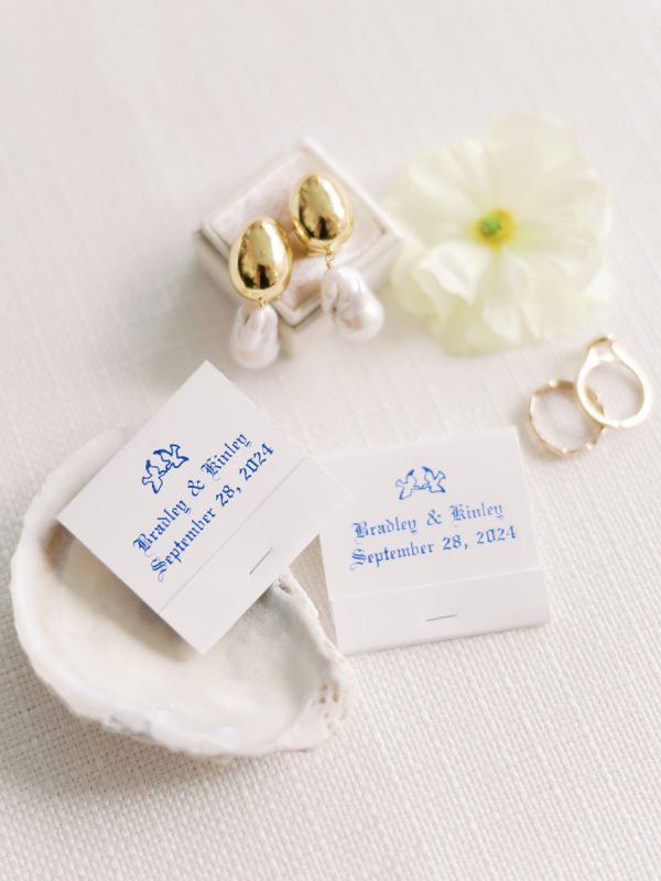 touches, featuring a shell bowl with custom matches, cocktail napkins
