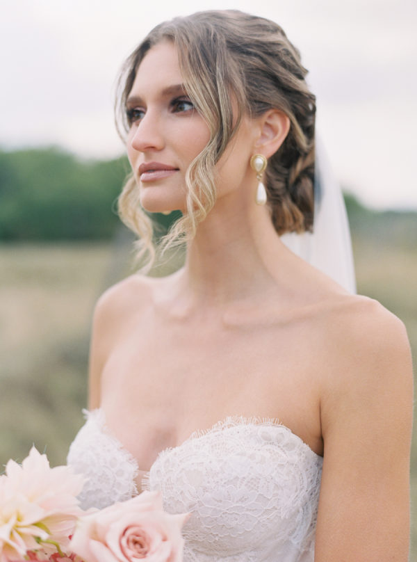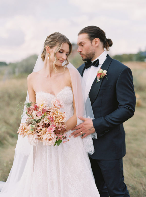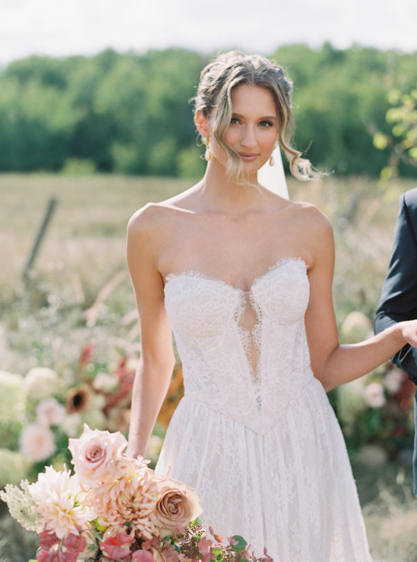 Our bride wore gowns and a veil from The Bridal Boutique YQR that embodied romantic refinement — elegant silhouettes with soft structure and effortless movement. Each look paired beautifully with Bella Belle Shoes for an understated, feminine touch. For this editorial, we featured three stunning bridal gowns that embody romance, modern elegance, and ethereal beauty. The Wtoo Charlotte 11053 is a vintage-inspired A-line gown with a strapless sweetheart neckline, delicate Chantilly lace bodice, basque waist, and a flowing chapel-length train that exudes timeless romance. The Martina Liana 1806 offers a sleek, fashion-forward silhouette in high-shine sandwashed silk satin, featuring a strapless sweetheart neckline, draped corset detailing, and a minimalist row of fabric-covered buttons down the back, perfect for the modern bride. Finally, the Essence of Australia D3636 is a soft, ethereal A-line gown crafted in chiffon with a plunging notched neckline, pleated wrapped bodice, and detachable off-the-shoulder sleeves, flowing into a delicate skirt with a subtle side slit and dramatic train. Each gown brings a unique texture, silhouette, and style to the editorial, creating a diverse yet cohesive bridal story.