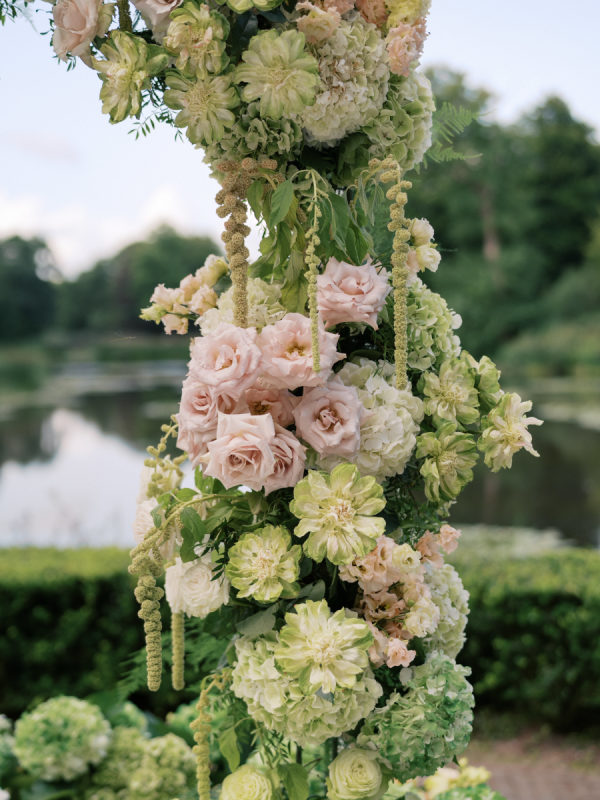 Katya Hutter, floral designer: “The floral design for Vivian and Long’s wedding at one of the finest estates in the Netherlands, Parc Broekhuizen, was inspired by the estate’s idyllic surroundings, the tranquil lake behind the main building, and the abundance of soft green hydrangeas gracing the gardens. Our vision was to create floral art that blended seamlessly with the natural landscape while making an artistic statement in tune with modern fashion aesthetics. We incorporated similar soft green hydrangeas and quicksand roses among a dozen other premium blooms. Cascading strands of green amaranthus were added as playful accents, resembling delicate earrings adorning the arch. The blend of fashion, floral art, and natural harmony makes this design so special to me.”