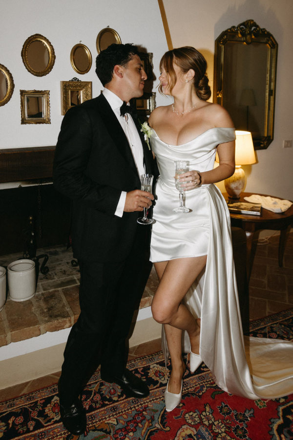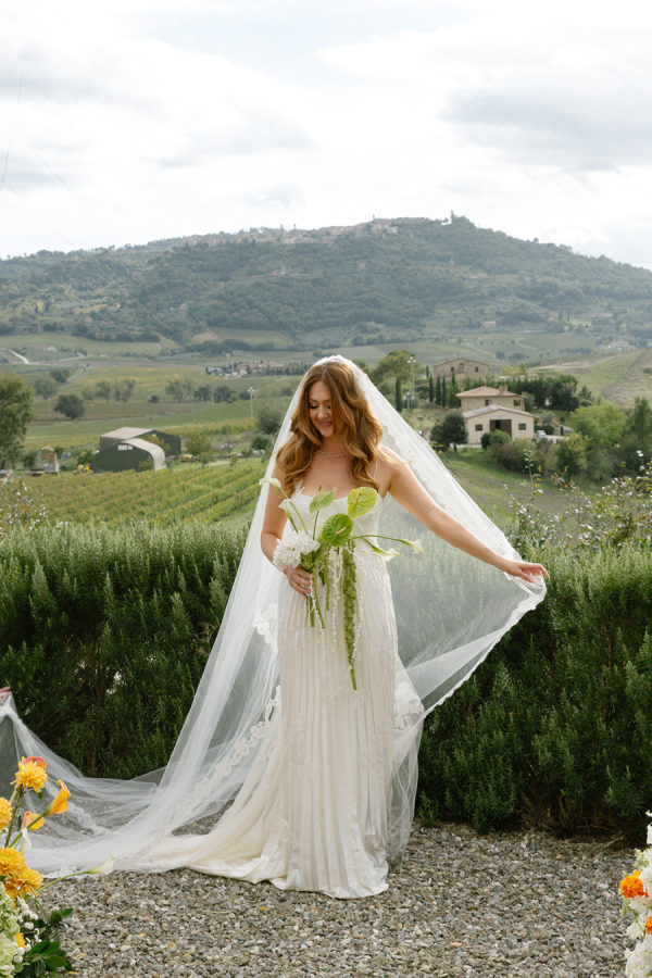 The bride wore a silk pleated gown by New York–based designer Danielle Frankel, featuring clean lines and an effortlessly romantic silhouette. Tailored to perfection with subtle strap adjustments and a refined hem, the dress embodied modern elegance for her Italian villa celebration.