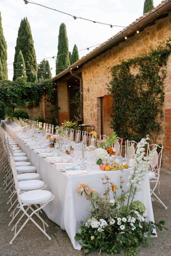 The reception featured an elegant, family-style tablescape layered with soft linens, candlelight, and organic floral arrangements that felt both refined and natural. Lush greenery and seasonal blooms were styled intentionally to echo the surrounding Tuscan hills, creating a setting that felt timeless, romantic, and effortlessly inviting.
