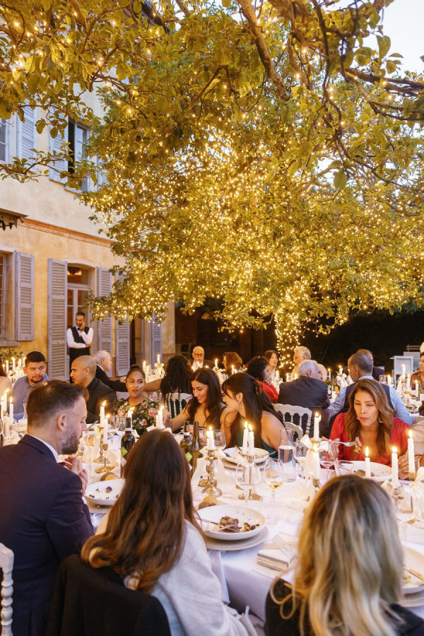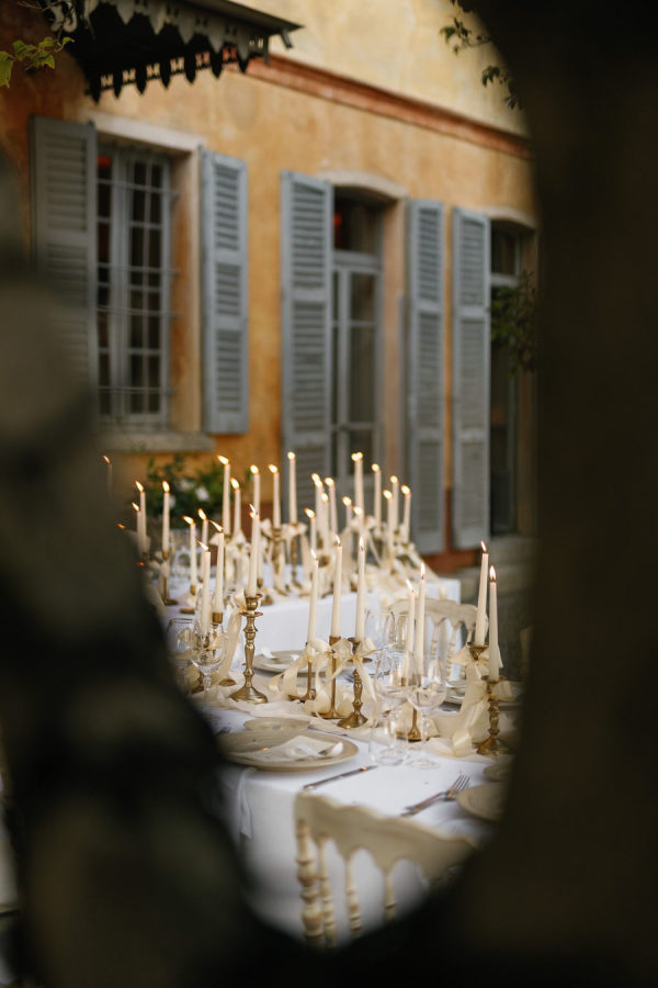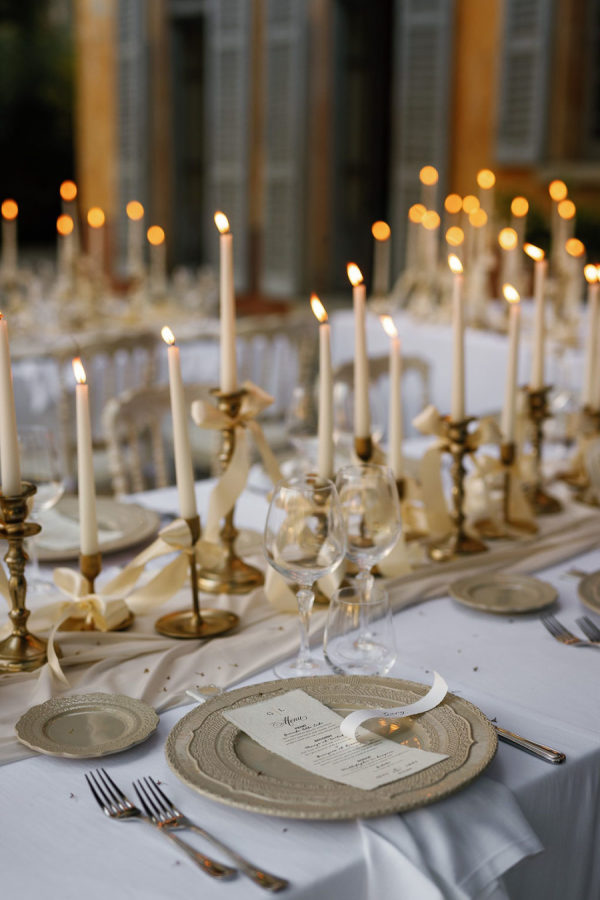 For dinner, the candles create the intimate mood with their soft light. We added ribbons on the gold candelabra.
