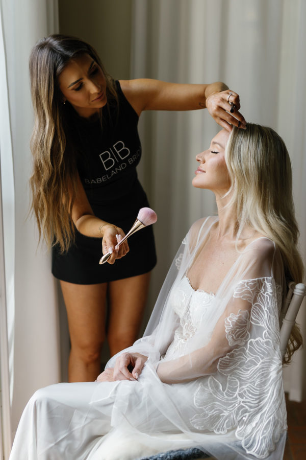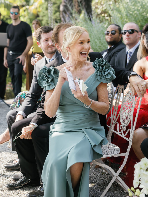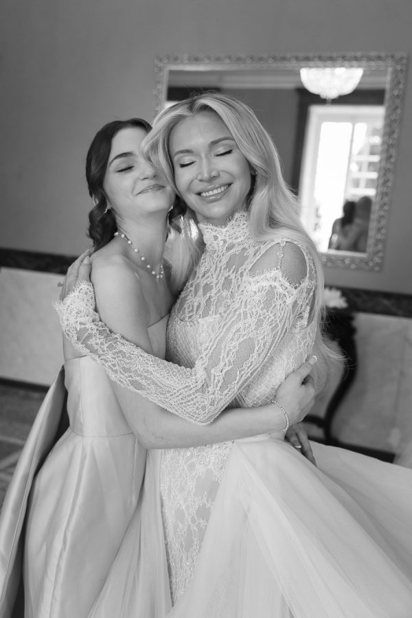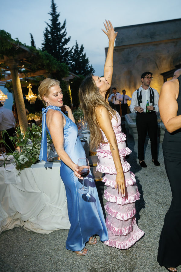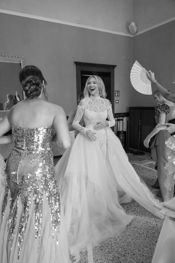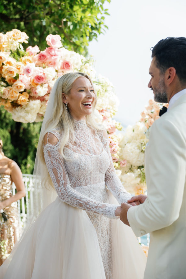 The bride made a breathtaking statement in a couture creation by Galia Lahav — a masterpiece of design that seamlessly blended elegance, romance, and modern versatility. This stunning gown was not just one look, but three exquisite bridal moments in one. The ceremony began with the bride wearing a long-sleeved, lace top delicately embroidered and sheer, adding a touch of timeless elegance and modesty. The intricate floral lace complemented the garden setting beautifully and created a regal silhouette perfect for the vows. Draped over the gown was a voluminous tulle overskirt that flowed like a cloud, adding drama and grandeur as she walked down the aisle. The full skirt featured layers of soft blush and ivory, creating a romantic, ethereal effect that caught the sunlight and swayed with every step. For the boat ride, the overskirt was removed to reveal the show-stopping look: a form-fitting mermaid sheath dress, shimmering with subtle embellishments and contouring her figure with striking elegance. As the celebration continued, before the dinner, the lace top was removed too. This sleek silhouette allowed for movement and ease — ideal for dancing the night away in style.