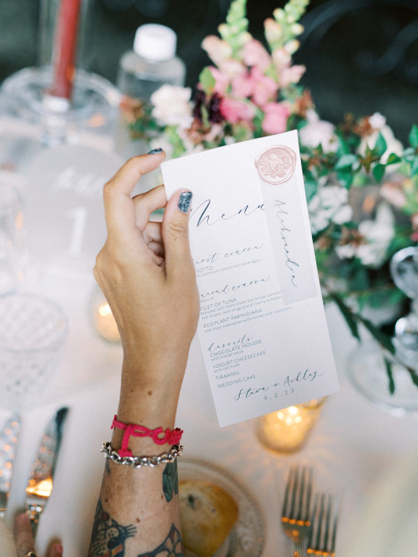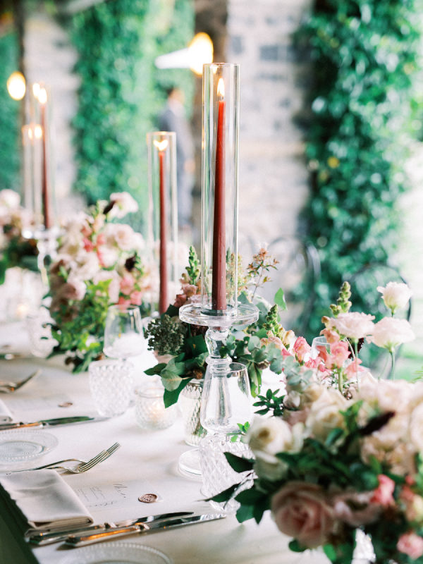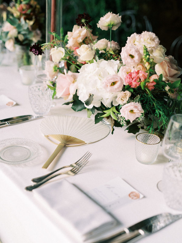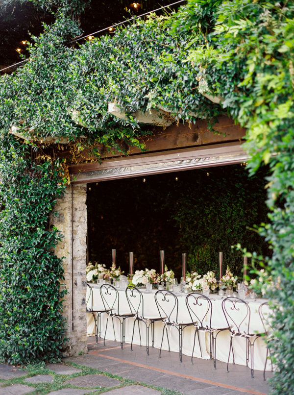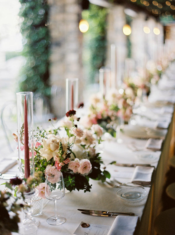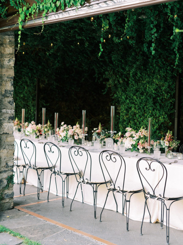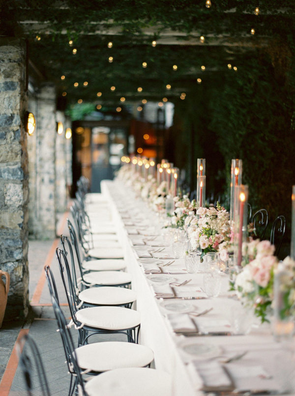 [field title=”Florals & Decor”]The florals were carefully selected in collaboration with the bride and Figli Dei Flori to perfectly match the beautiful surroundings of the villa’s garden. The guests dined al fresco at a long table under a canopy of fairy lights and greenery, creating an intimate experience. Pink snapdragons and burgundy pincushions gave dramatic splashes of color to the table.[/field]