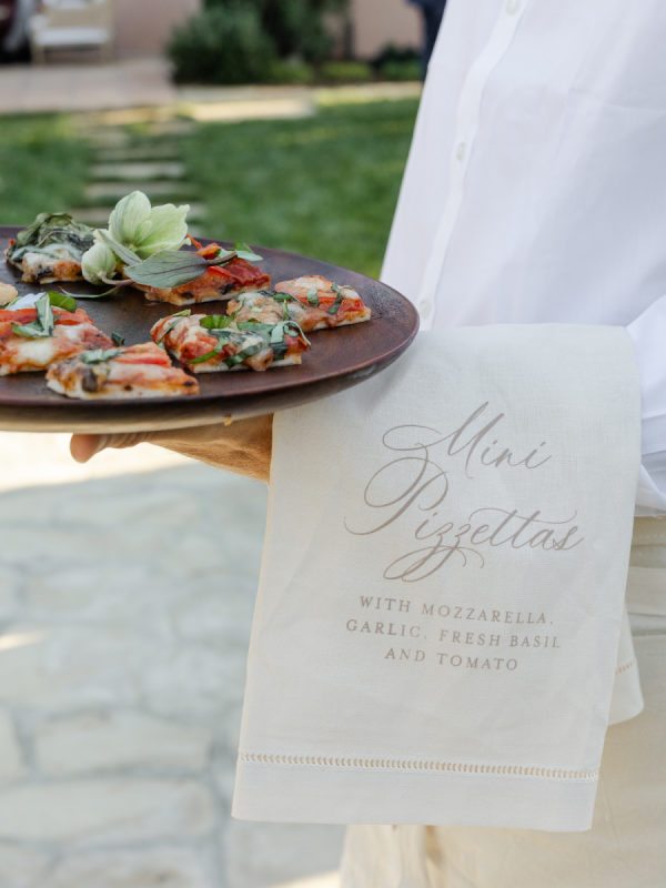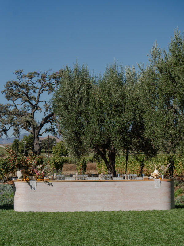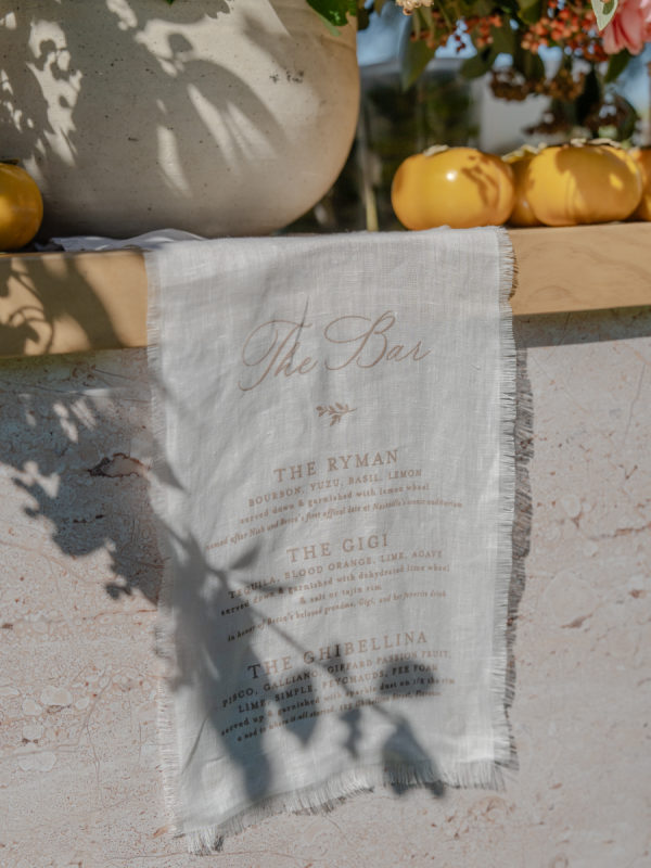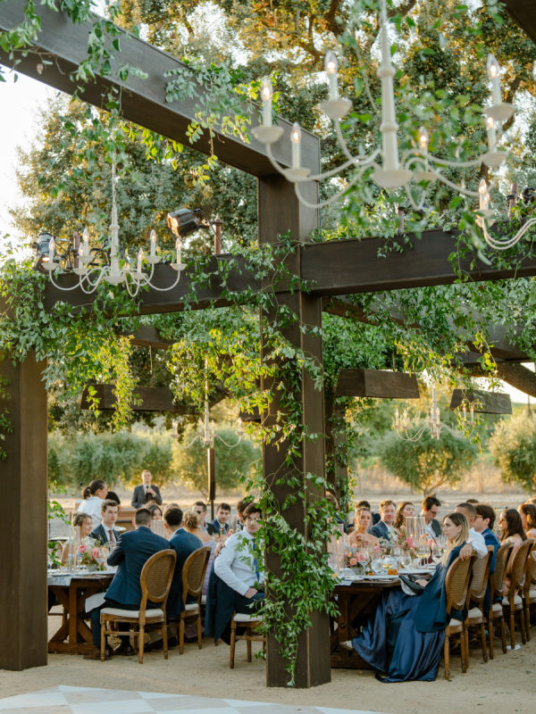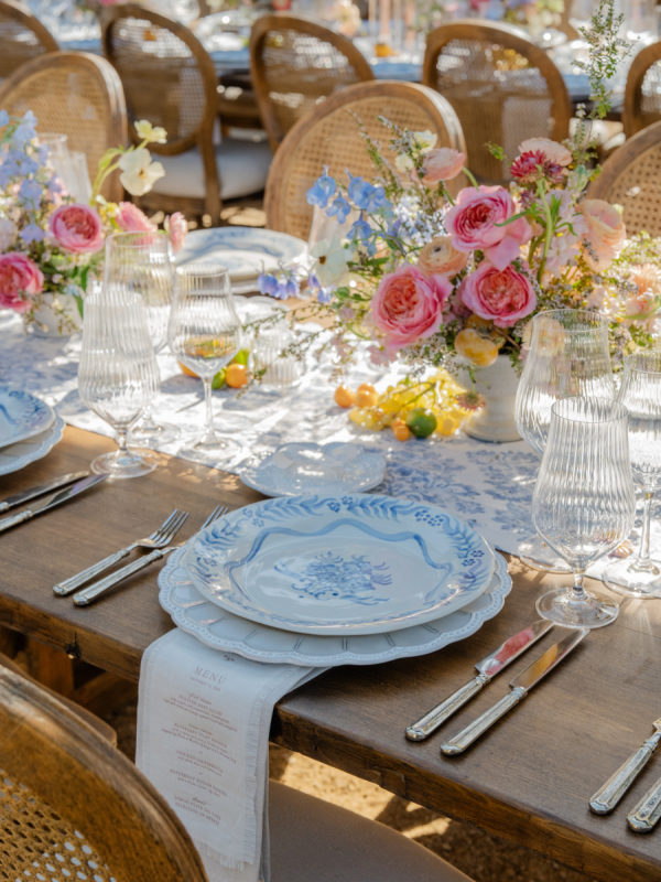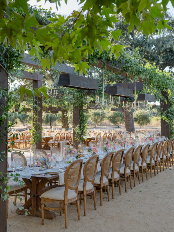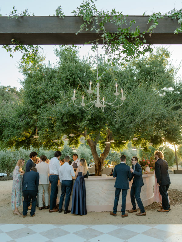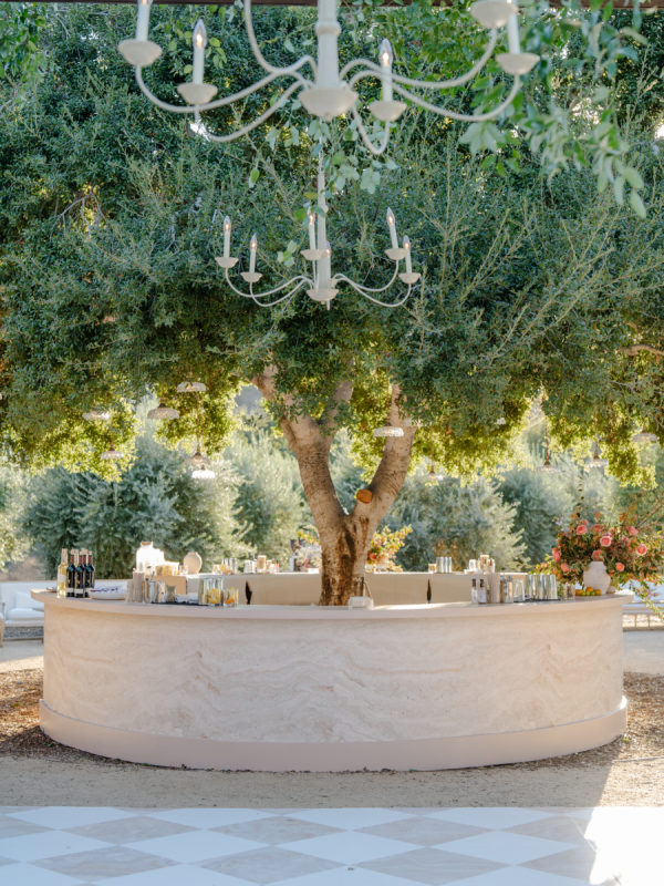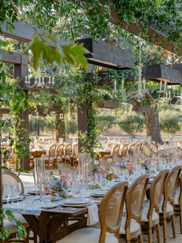 Nick and I met in Florence, Italy, while studying abroad during our junior year of college, so Italy has always held a special place in our hearts. We initially considered getting married there, but ultimately, California made the most sense for our families. Still, we knew we wanted to bring a Tuscan-inspired feel to our wedding, and when we discovered La Tarantella, it truly felt like Italy had been brought to us. Our reception design revolved around the venue’s breathtaking oak tree, with a custom round, marble-inspired bar serving as the focal point. Marble, along with linens and ceramics, were elements we weaved in throughout the day to evoke the essence of Tuscany. Linen was used for our bar menu at cocktail hour and the dinner menus at the reception, adding a soft touch. One of our favorite design elements was the blue hand-painted ceramic dinner plates, which felt like a nod to Italian craftsmanship. We paired the plates with ribbed wineglasses and scalloped chargers to match the playfulness of the design. In addition to the round reception bar, our cocktail bar and dance floor were also designed to replicate the beauty of marble, creating a cohesive look. Blending our wedding seamlessly with La Tarantella’s natural beauty was also a priority. To do so, we selected dark wood pews for the ceremony, as well as dark wood dining tables and chairs for the reception. The dark wood perfectly complemented the large oak trees on the property. The venue’s signature dusty-rose tone inspired the font color for our invites and menus, as well as the marble tones of the cocktail and reception bars, dance floor, and florals. Every choice was made to reflect the warmth and romance of Tuscany while embracing the stunning setting we fell in love with – even down to the name cards at the reception tables, which were Italian-inspired scrolls with dusty-rose calligraphy, and the table numbers, which were inspired by the plaster walls of Italian apartments.