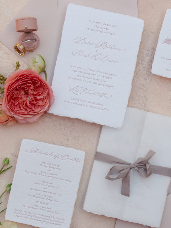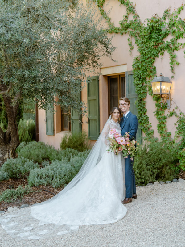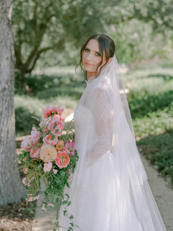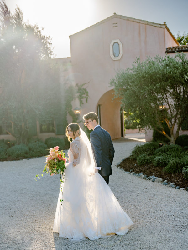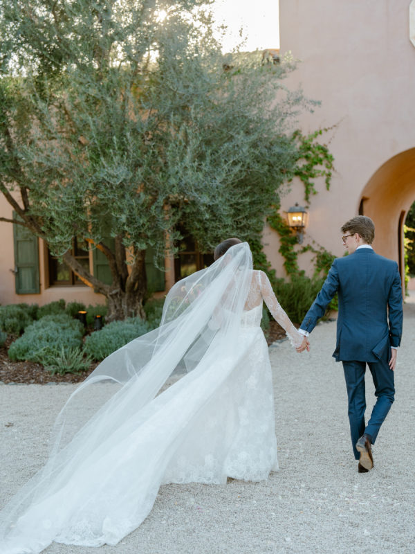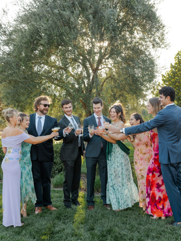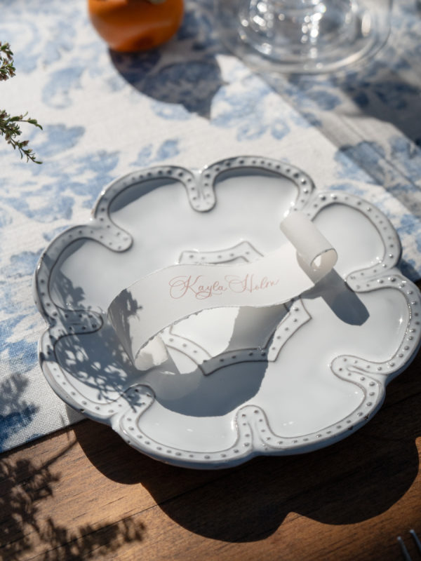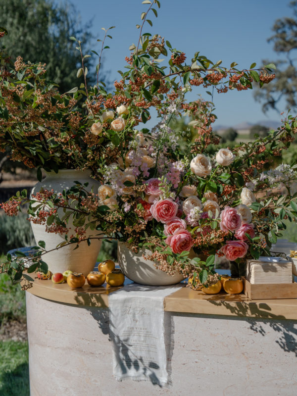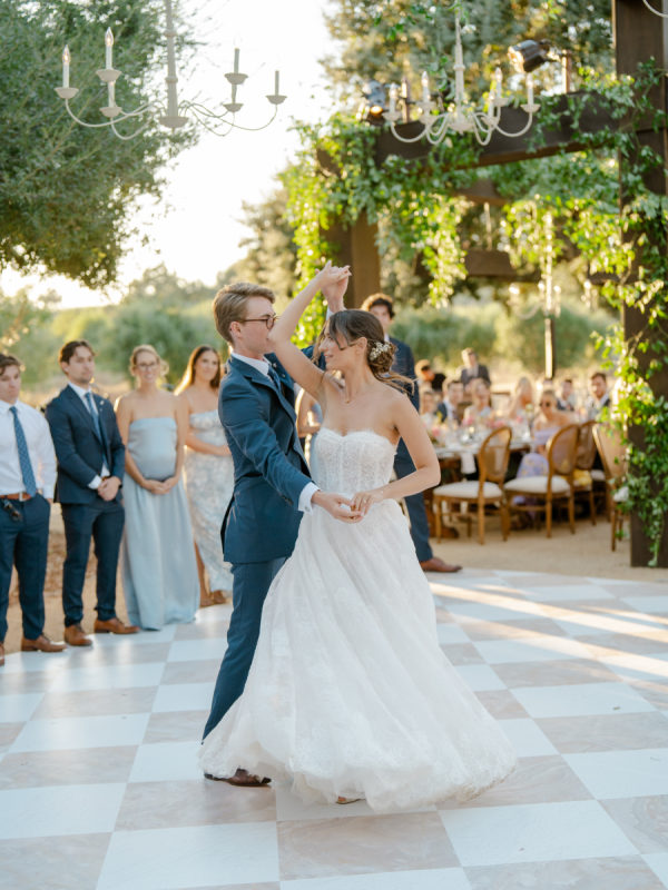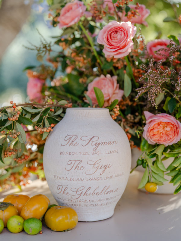 Nick and I met in Florence, Italy, while studying abroad during our junior year of college, so Italy has always held a special place in our hearts. We initially considered getting married there, but ultimately, California made the most sense for our families. Still, we knew we wanted to bring a Tuscan-inspired feel to our wedding, and when we discovered La Tarantella, it truly felt like Italy had been brought to us. Our reception design revolved around the venue’s breathtaking oak tree, with a custom round, marble-inspired bar serving as the focal point. Marble, along with linens and ceramics, were elements we weaved in throughout the day to evoke the essence of Tuscany. Linen was used for our bar menu at cocktail hour and the dinner menus at the reception, adding a soft touch. One of our favorite design elements was the blue hand-painted ceramic dinner plates, which felt like a nod to Italian craftsmanship. We paired the plates with ribbed wineglasses and scalloped chargers to match the playfulness of the design. In addition to the round reception bar, our cocktail bar and dance floor were also designed to replicate the beauty of marble, creating a cohesive look. Blending our wedding seamlessly with La Tarantella’s natural beauty was also a priority. To do so, we selected dark wood pews for the ceremony, as well as dark wood dining tables and chairs for the reception. The dark wood perfectly complemented the large oak trees on the property. The venue’s signature dusty-rose tone inspired the font color for our invites and menus, as well as the marble tones of the cocktail and reception bars, dance floor, and florals. Every choice was made to reflect the warmth and romance of Tuscany while embracing the stunning setting we fell in love with – even down to the name cards at the reception tables, which were Italian-inspired scrolls with dusty-rose calligraphy, and the table numbers, which were inspired by the plaster walls of Italian apartments.