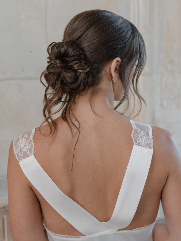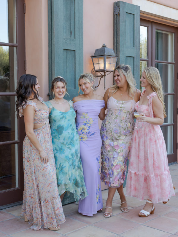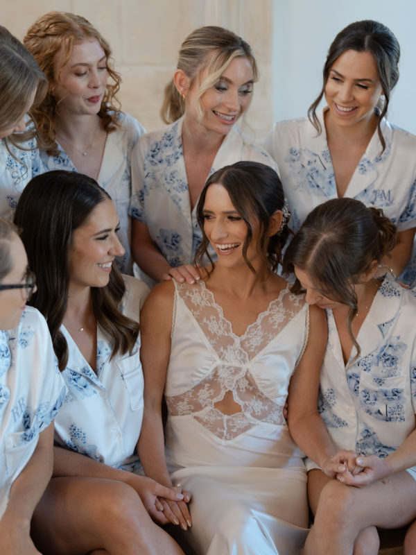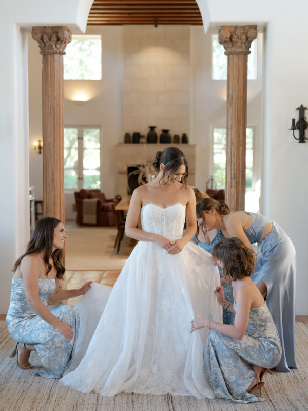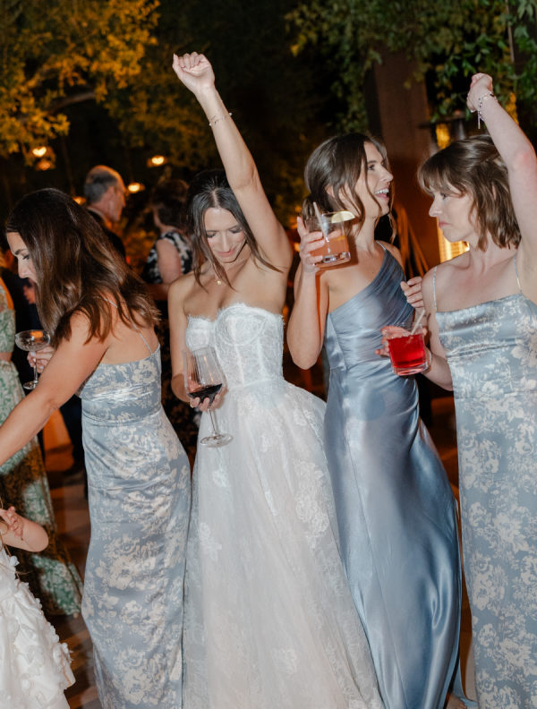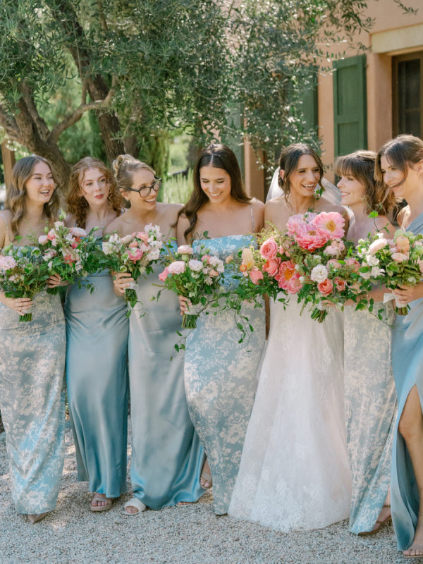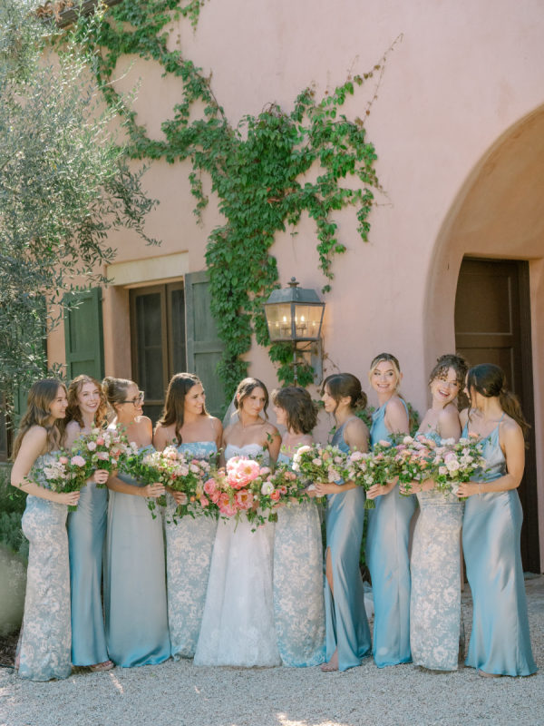[field title=”Bridesmaid Dresses”]I fell in love with the softness of Reformation’s Frankie silk dress in Porcelain for my bridesmaids. I knew I wanted some variation in their looks, so I paired different styles from Shona Joy’s La Lune collection in powder blue. The soft blue of the Reformation dress became a key inspiration throughout our design, influencing the cocktail hour table linens, reception runner, bar menus at the Piaggio truck and coffee cart, and even the floral arrangements at the reception.[/field]