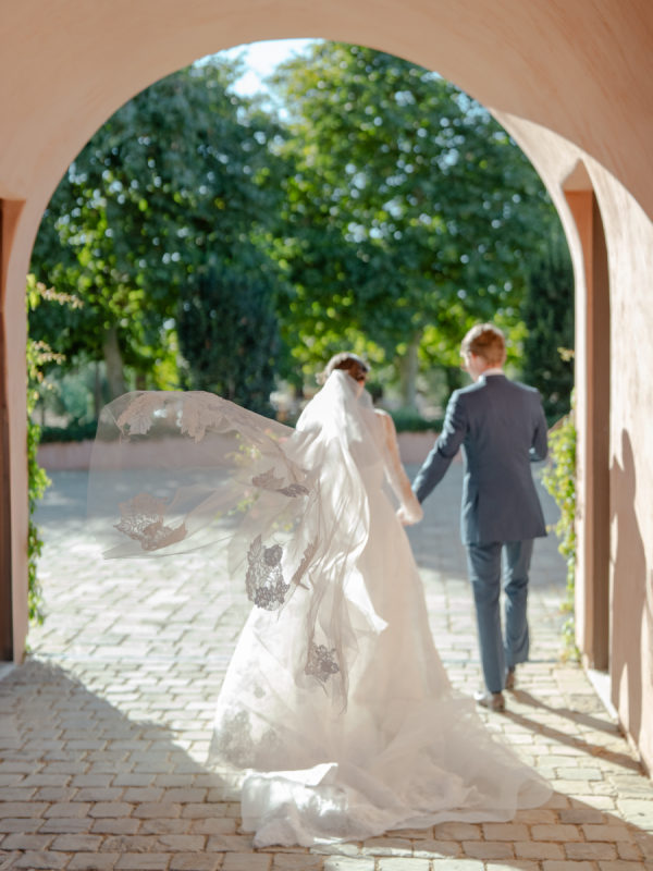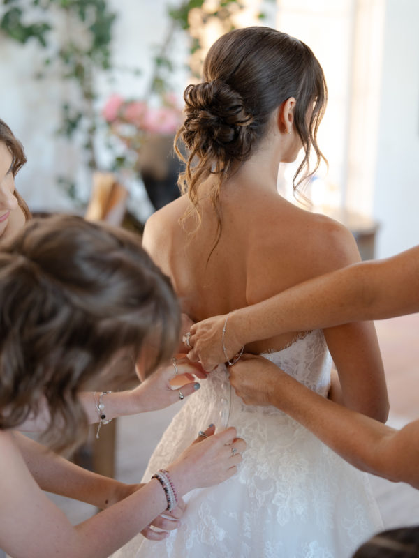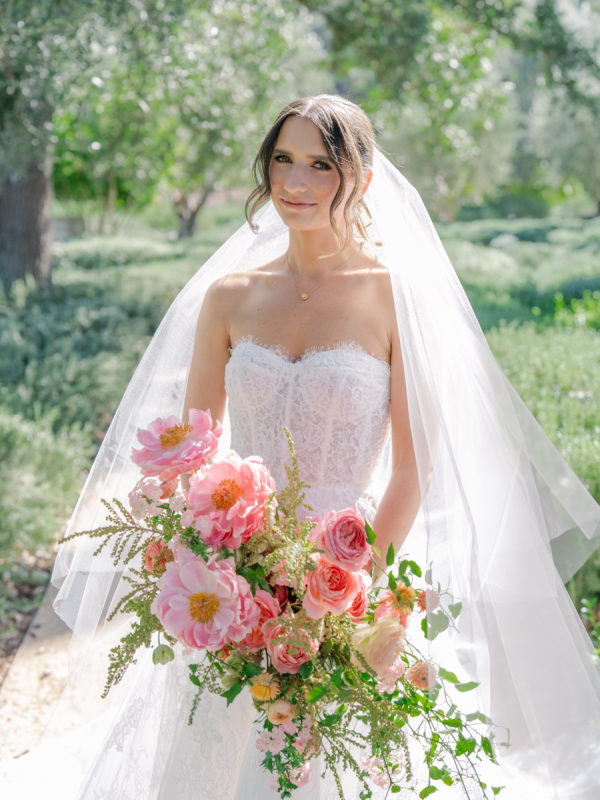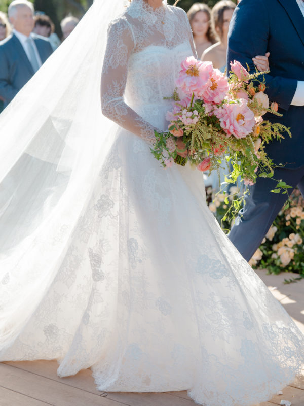For my dress shopping, my mom, sisters, and lifelong best friend joined me in L.A., making it such a special experience. We visited several boutiques, but I kept coming back to Monique Lhuillier’s designs. While I loved every dress I tried on, I didn’t find the one until my second visit. I ultimately chose the Kate gown by Monique Lhuillier—it felt so romantic, delicate, and timeless, which aligned beautifully with our venue. The Chantilly lace also reminded me of Paris, where Nick and I lived together for a month, adding an extra sentimental touch. I worked with Monique to customize the gown, adding a transparent bodice, satin-covered buttons, and a two-foot train. For the ceremony, I paired it with the Helena jacket and matching Kate veil, extending the veil by two feet so the lace details would be even more visible against my train. For the after-party, I changed into the Rosa Mini by Australian designer Christie Nicole. As a dancer, I knew I wanted a mini dress to move freely, and I loved that the Rosa Mini felt just as timeless as my wedding gown while offering something different—it featured intricate beading and appliqués instead of lace. My accessories were equally meaningful. I wore a gold and diamond pendant necklace from Nick’s grandmother, featuring delicate olive leaf details—so fitting for our Tuscan-inspired wedding. I borrowed my hair clip from my older sister, who wore it on her wedding day. I also wore my opal ring that belonged to my grandmother, a piece I wear daily, and had a locket my sister gifted me tied around my bouquet. I paired these with Jimmy Choo heels and carried a Bella Rosa clutch, which felt perfect since it was Italian-made and complemented my after-party dress beautifully.