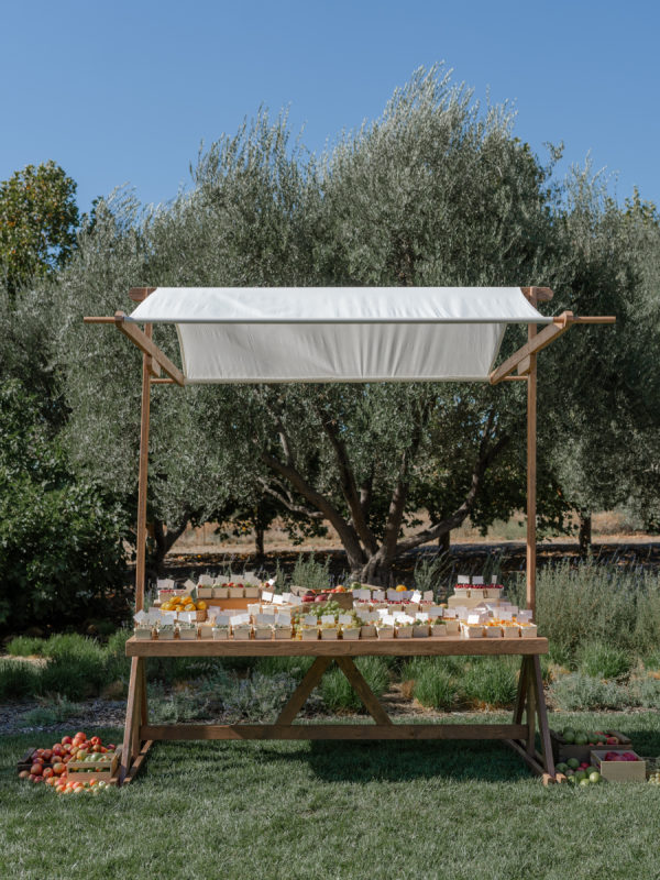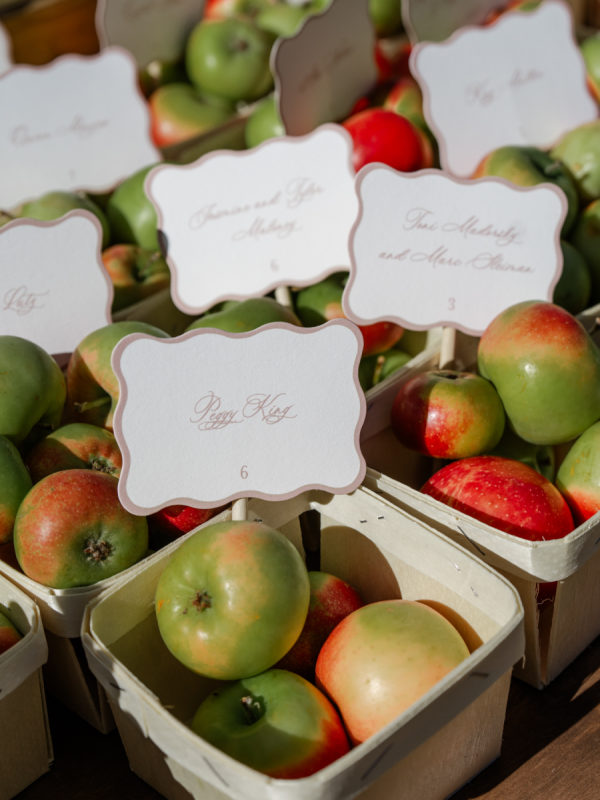 One of our favorite elements of the wedding was our escort card display, which was inspired by our weekly trips to the farmers market, where we do most of our grocery shopping. The display featured fresh, seasonal fruits, making it not only a beautiful and sentimental touch but also interactive for our guests.