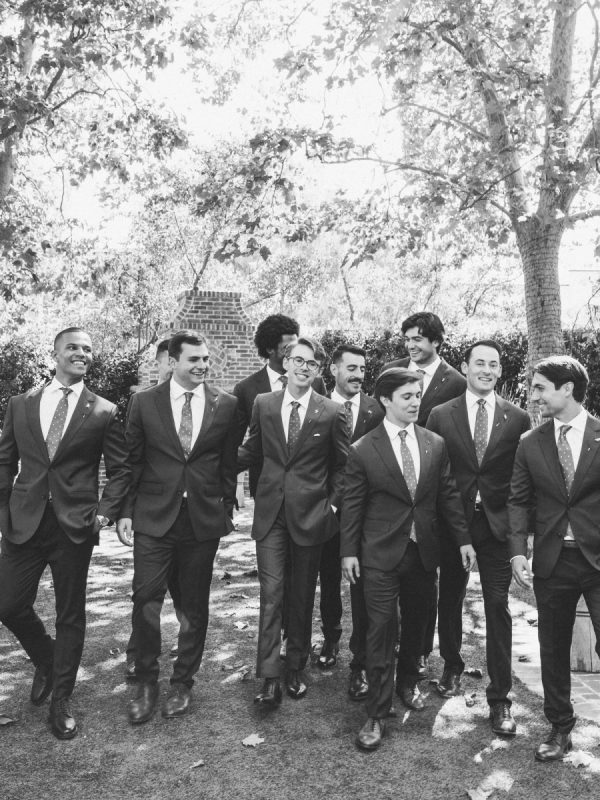 We also wanted our welcome bags to be deeply personal and reflective of our story. Among other items, we included Vandy potato chips as a nod to our college, a fresh-baked croissant to remember our month in Paris, and chocolate from the Italian brand Venchi as a tribute to where we first met. Instead of traditional boutonnieres, Nick and his groomsmen wore lapel pins. Each pin was selected by Nick to represent something meaningful about his friendship with that particular groomsman. For his pin, Nick wore a fleur-de-lis as a nod to Italy, where our journey began.
