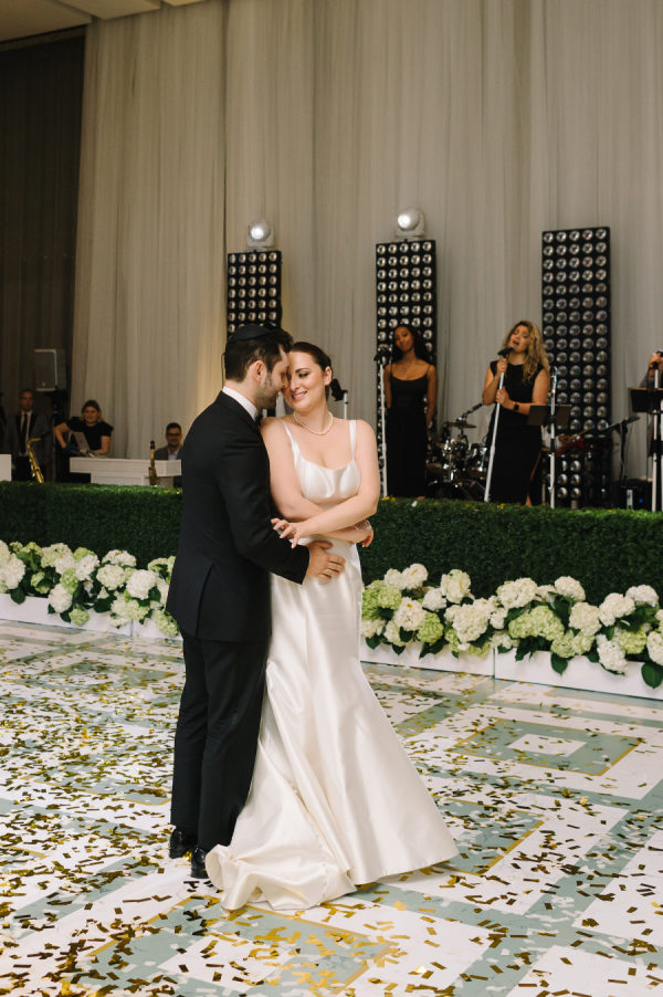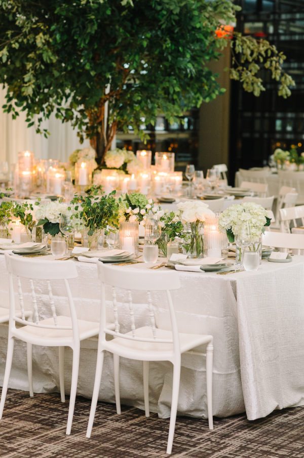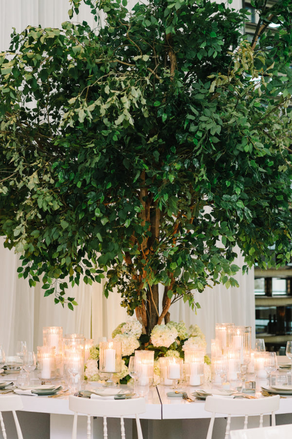 [field title=”Florals & Decor”]Our clients envisioned a fresh modern garden for their wedding day. Although the wedding was indoors, garden elements were brought into the design and the Four Seasons Ballroom was in full bloom. Key floral features included a beautiful white four post chuppah. A garland of fresh green and white hydrangeas wrapped around the structure and designed to look like they grew there. Guests enjoyed the ceremony from under the canopy of two custom designed large ficus trees. Later the ceremony space would be converted into a formal reception area. Guests dined under the trees and were transported into a beautiful spring garden detailed with an abundance of fresh florals.[/field]