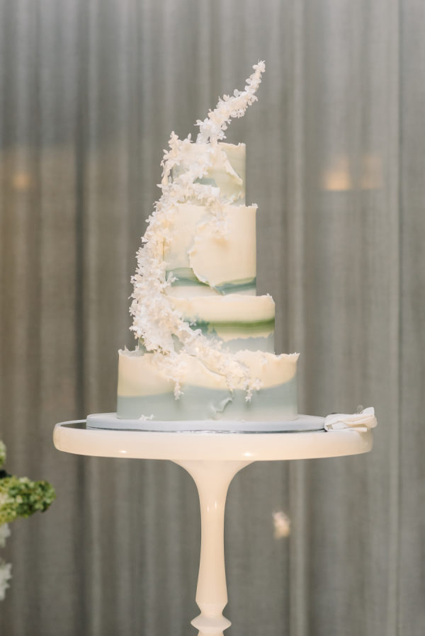 [field title=”Wedding Cake”]Our cake was beautifully designed by Truffle Cake and Pastry. We worked directly with Christina to create a wedding cake that would look amazing stationed under our chuppah for the reception, while simultaneously complementing the aesthetics of it. She created a four tier white cake with rough edging and a soft green colour running through the fondant to match our wedding florals. We chose salted caramel and vanilla to keep the flavours light for a July wedding. The floating hydrangea effect was our focal point and was designed to look like a hydrangea from the chuppah was shedding its petals creating a beautiful cascading floral look.