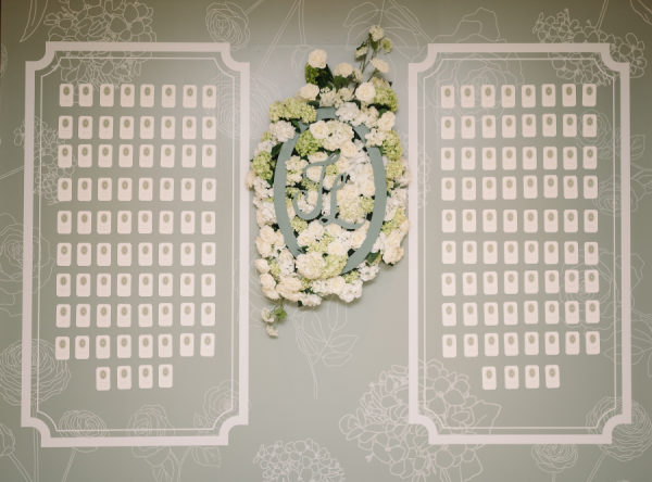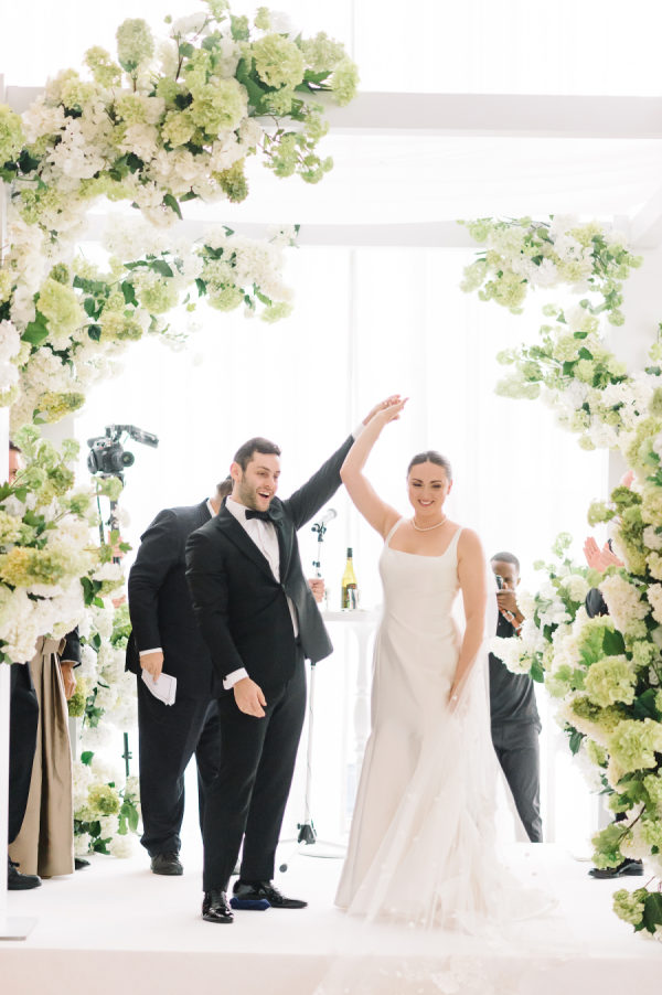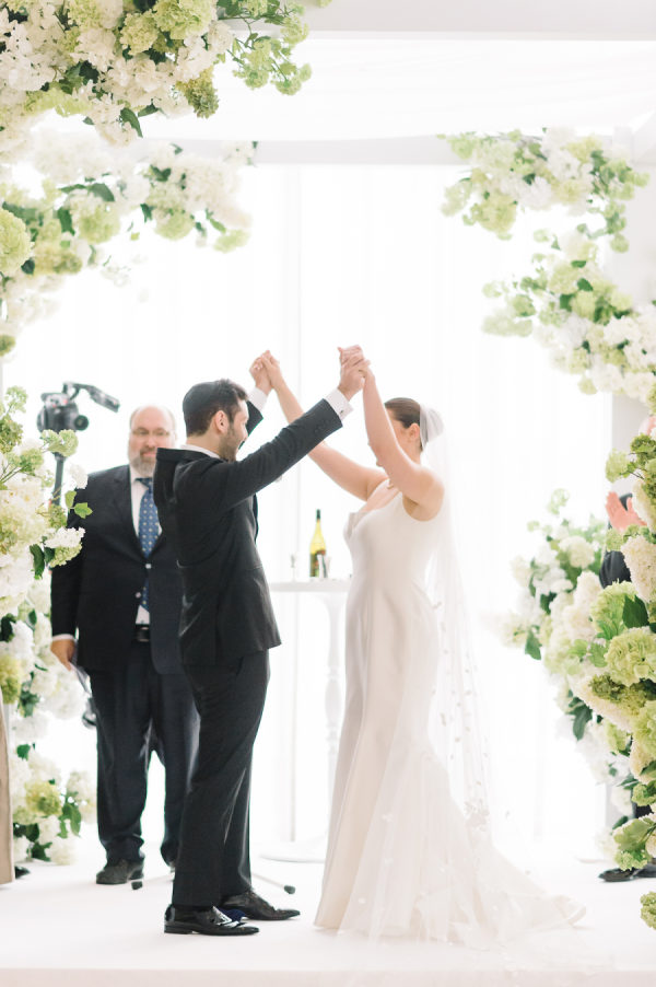 [field title=”Design / Vibe / Vision”]Our clients envisioned a fresh modern garden for their wedding day. Although the wedding was indoors, garden elements were brought into the design and the Four Seasons Ballroom was in full bloom. Key floral features included a beautiful white four post chuppah. A garland of fresh green and white hydrangeas wrapped around the structure and designed to look like they grew there. Guests enjoyed the ceremony from under the canopy of two custom designed large ficus trees. Later the ceremony space would be converted into a formal reception area. Guests dined under the trees and were transported into a beautiful spring garden detailed with an abundance of fresh florals. [/field]