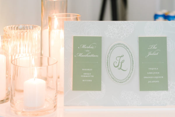 [field title=”Food & Drink”]With the help from our wedding planner Melissa Baum, we came up with signature drinks that reflected us as a couple. We featured a Morkie in Manhattan and The Juliet as a nod to our cute teddy bear morkie who kicked off our relationship. The Morkie in Manhattan was a classic style Manhattan cocktail that featured a sugar disk with Juliet’s face motif on it. It was a literal Morkie in our guest’s Manhattans! The Juliet was a spicy margarita to reflect Juliet’s sass with a custom stir stick of our monogram that was featured on our invitations by Smudge Designs. The food was catered by the Four Season’s Hotel and was carefully planned out. For cocktail hour we chose to serve sushi as we were going to Japan for our honeymoon. For dinner, the miso and orange glazed black cod was a crowd favourite, while the wild mushroom risotto was a nod to the European inspired theme of the wedding. Molten chocolate lava cake is our favourite dessert and we were happy to include that on our wedding menu. The gelato cart was another way we incorporated European summer vibes as gelato shops are the place to be after indulging in an Italian dinner. We had custom gelato cups made with our monogram on them, and featured our favourite flavours like pistachio and coconut which matched our decor. Our late night food was sliders, fries and truffle mac and cheese. We ate our hearts out!