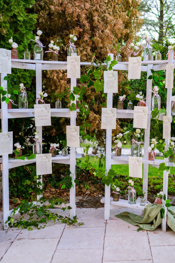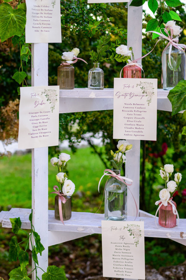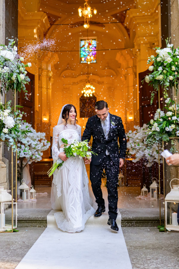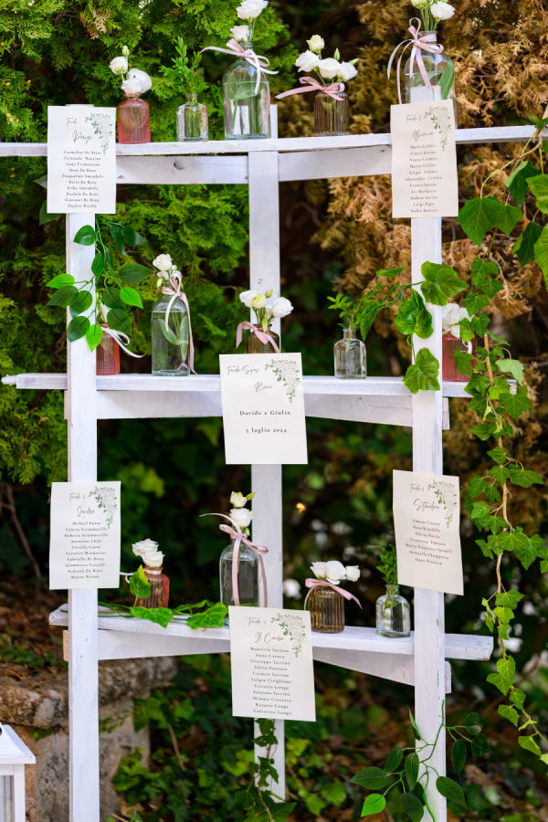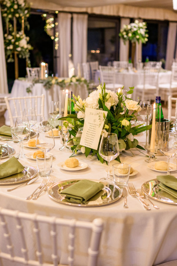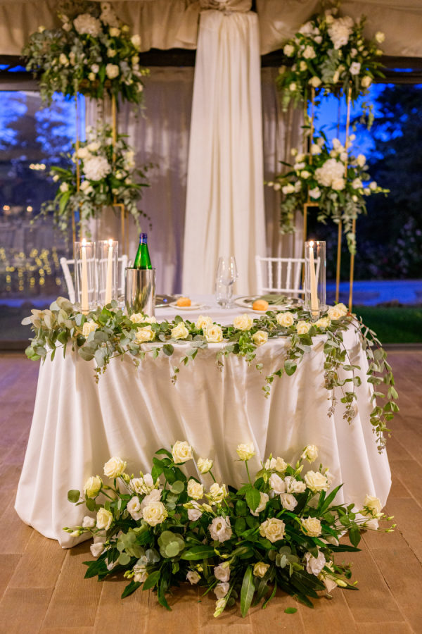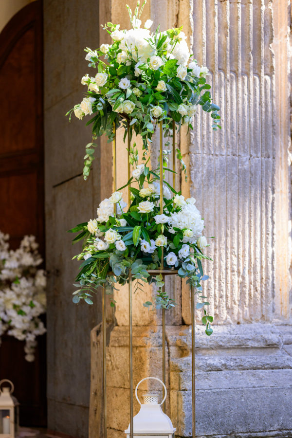 The wedding’s floral design masterfully balanced timeless elegance with organic romance, featuring a sophisticated white and green color palette throughout. Towering gold stands adorned the church entrance, crowned with lush arrangements of white hydrangeas, roses, and cascading greenery, while classic white lanterns lined the aisle. The reception space was transformed by dramatic elevated centerpieces on golden pedestals, creating an ethereal garden atmosphere. The sweetheart table showcased an artfully crafted cascade of cream roses and silver dollar eucalyptus that draped elegantly over crisp white linens. A creative seating chart display married form and function, featuring a white lattice structure adorned with delicate bud vases, each holding a single rose tied with blush ribbon, interwoven with climbing ivy. The overall design achieved a perfect harmony between classic Italian architecture and fresh, garden-inspired elements, creating an atmosphere of refined romance that felt both grand and intimately welcoming.