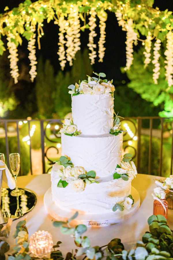 The elegant three-tiered wedding cake by Turassina perfectly embodied the wedding’s refined aesthetic. Each tier featured a romantic, textured buttercream finish with organic, wave-like patterns that created a sense of movement and artistry. Fresh white garden roses and eucalyptus were thoughtfully placed between the tiers, echoing the wedding’s overall floral design. The cake was beautifully displayed under a canopy of cascading white wisteria and twinkling lights, creating an enchanting garden atmosphere. The clean white-on-white design with touches of fresh greenery struck the perfect balance between timeless elegance and modern sophistication, while the artisanal texturing technique demonstrated exceptional craftsmanship that elevated this classic confection into a true centerpiece of the celebration.