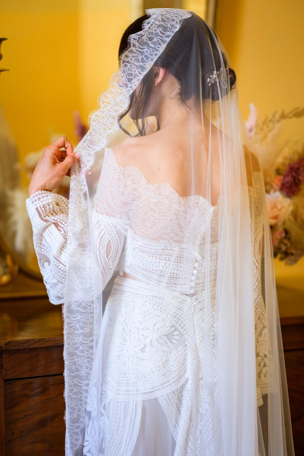 This exquisite wedding gown embodies timeless elegance with its intricate geometric lace patterns that cascade from shoulder to hem. The form-fitting silhouette gracefully follows the bride’s shape before subtly flaring at the bottom, creating a stunning visual flow. The dress features sophisticated long sleeves and a high neckline, while the all-over lace detailing showcases exceptional craftsmanship with its detailed motifs. A statement cathedral-length veil with delicate lace trim complements the gown perfectly, adding an extra layer of romance and grandeur to this classic yet contemporary bridal look. The combination of traditional elements with modern styling creates a gown that feels both timeless and fresh, photographed beautifully against the historic architectural setting.