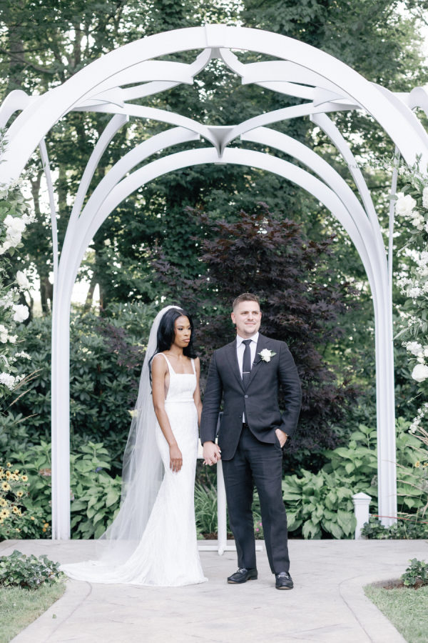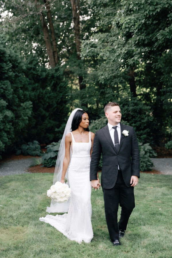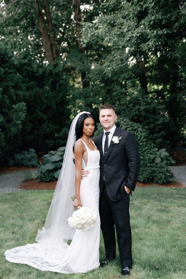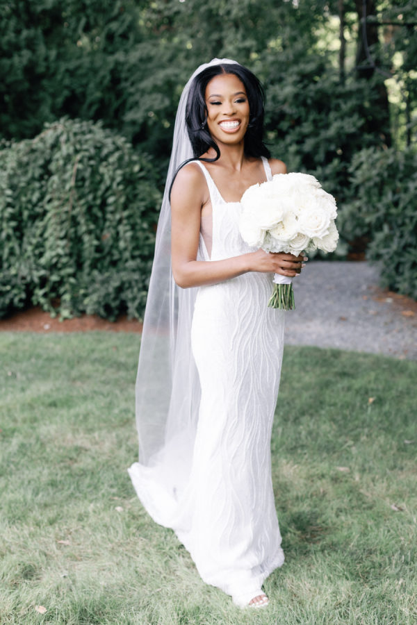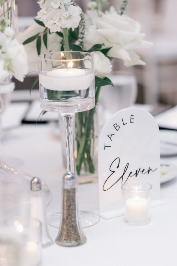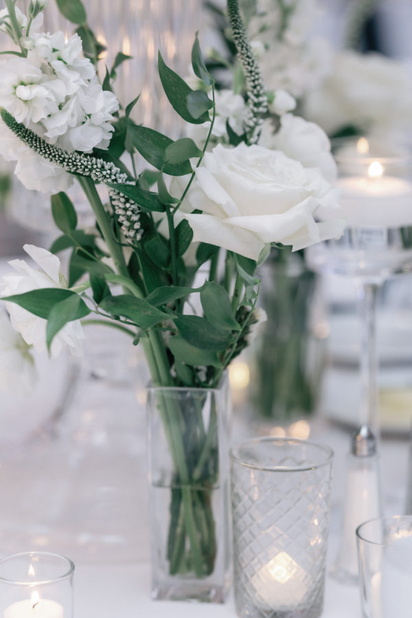 [field title=”Florals & Decor”]The florals from Yanique Events brought Mia and Jeff’s vision together perfectly. The white roses, white hydrangea and plush greenery really tied in all the other classic and timeless elements of their day. Mia’s bouquet was a beautiful arrangement of white roses and the ceremony arch was adorned with matching blossoms and greenery on each side of the arch, as well as boxed white floral bouquets lining the top and bottom of the aisle. Clean, modern floral designs continued into the reception. Each table consisted of raised, semi structured white floral displays surrounded by romantic bud vases and votive candles. [/field]