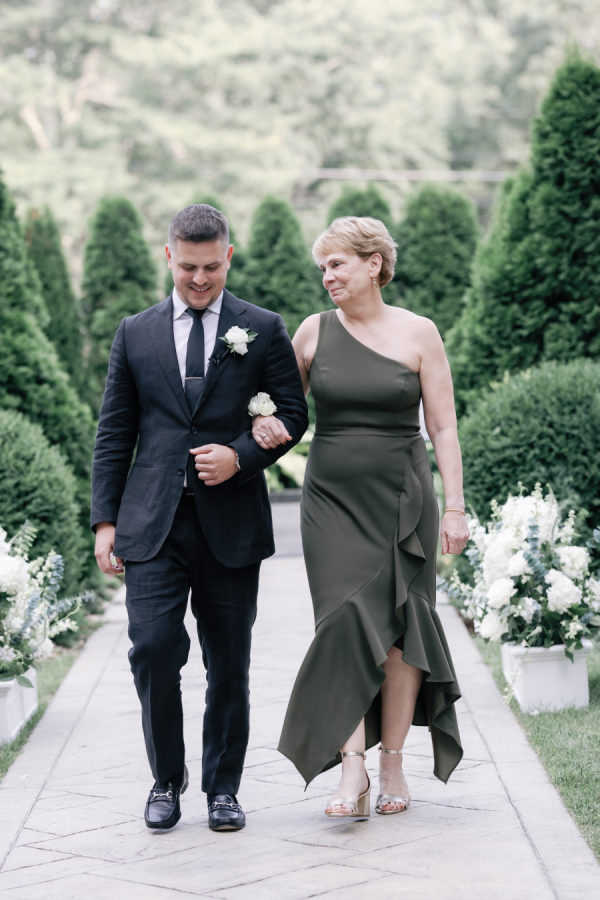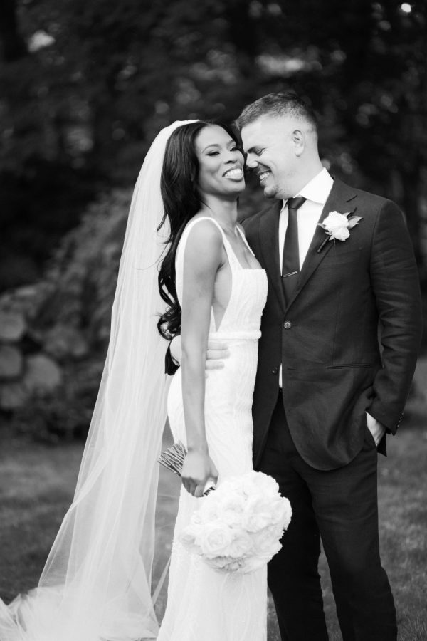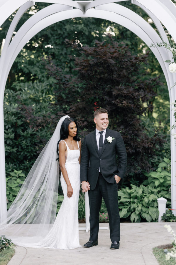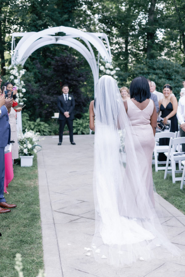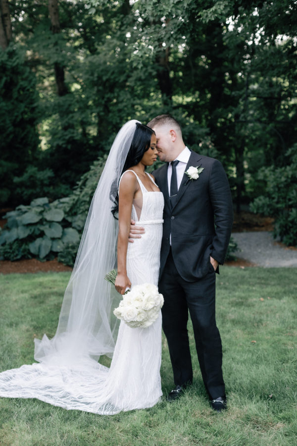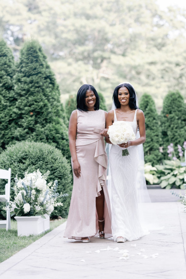 [field title=”Florals & Decor”]The florals from Yanique Events brought Mia and Jeff’s vision together perfectly. The white roses, white hydrangea and plush greenery really tied in all the other classic and timeless elements of their day. Mia’s bouquet was a beautiful arrangement of white roses and the ceremony arch was adorned with matching blossoms and greenery on each side of the arch, as well as boxed white floral bouquets lining the top and bottom of the aisle. Clean, modern floral designs continued into the reception. Each table consisted of raised, semi structured white floral displays surrounded by romantic bud vases and votive candles. [/field]