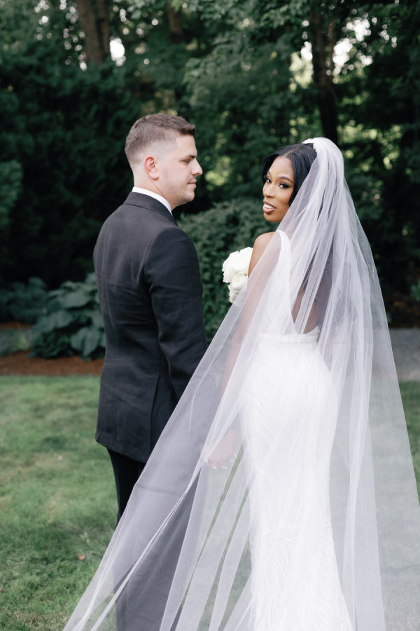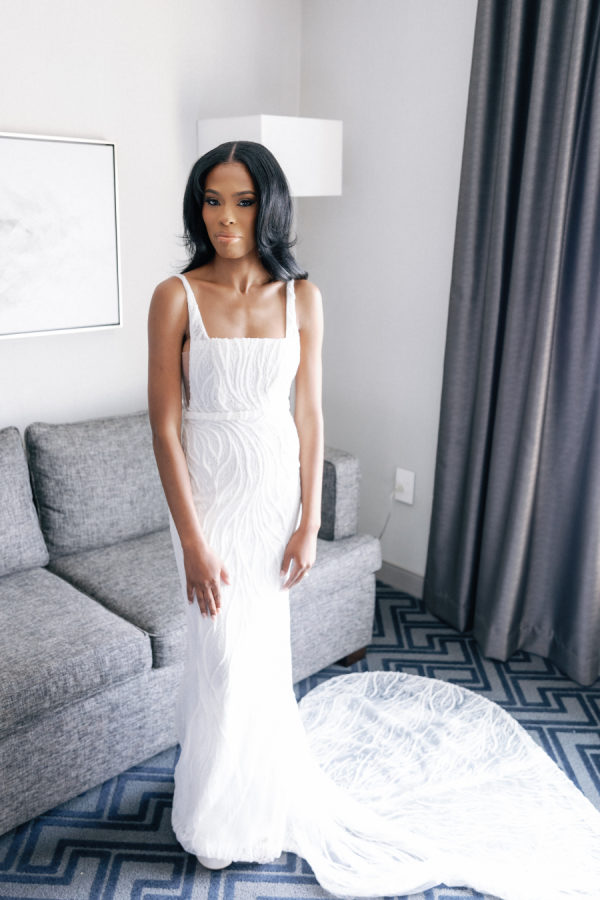 [field title=”Wedding Gown”]Keeping in fashion with her overall ambience, Mia selected a simple yet stunning square neck wedding gown designed by Made With Love with hand beaded detailing throughout. Prior to her bridal appointment at VOWS Bridal in Watertown, Massachusetts, Mia went to the shop’s website and scrolled through the dresses. It was love at first sight. She adored the beading on it and how it was simple but with a bit of a wow factor.[/field]