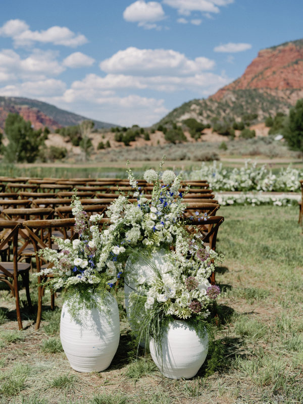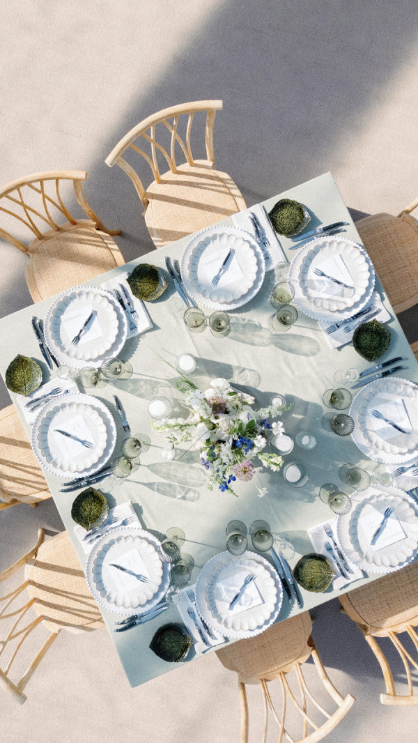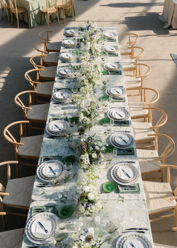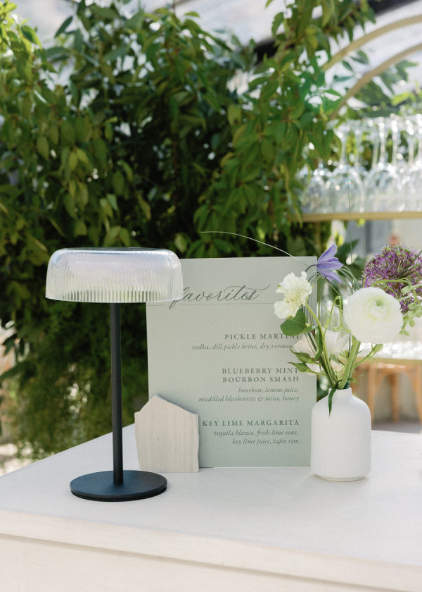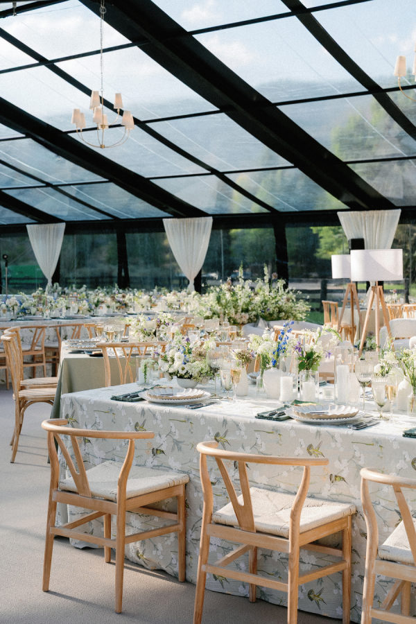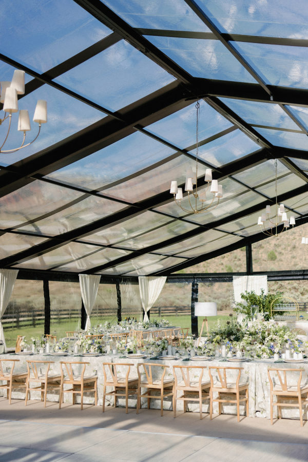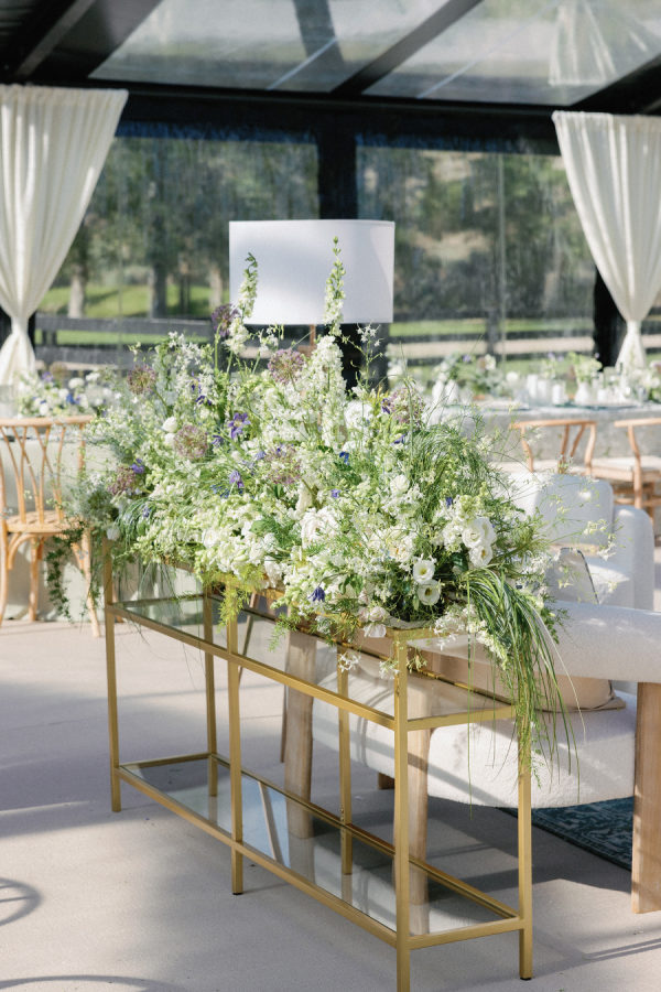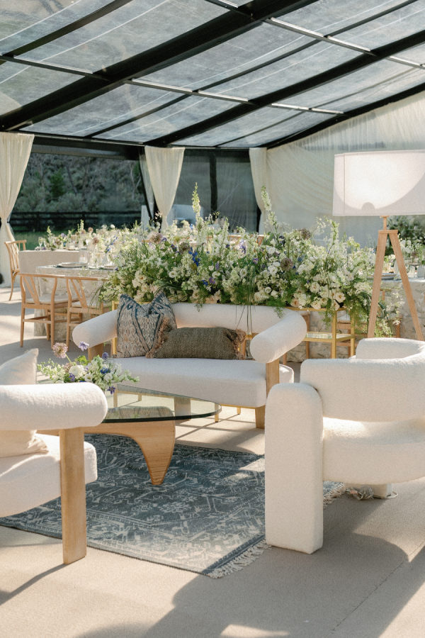 The vision was understated, organic elegance with a distinctly residential feel, an open, light-filled tent that felt more like a beautiful living room than an event space. Textural white florals, natural greenery, light wood chairs, and soft fabric backdrops created warmth and ease, while thoughtful lighting carried the atmosphere from golden hour into the evening. Everything felt intentional yet relaxed, inviting guests to settle in and stay awhile.