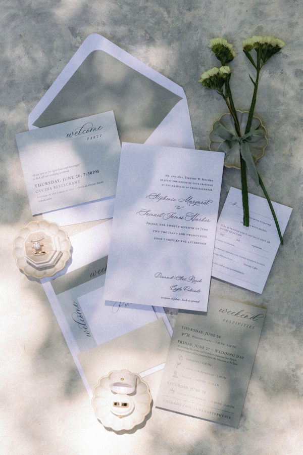 [field title=”Florals & Decor”]The florals were intentionally restrained and organic, designed around textured white blooms with only the natural greenery found within the flowers themselves. The bride’s bouquet was soft and sculptural, allowing shape and texture to take center stage, perfectly aligning with the day’s minimal, quietly elegant aesthetic.[/field]