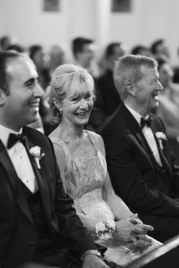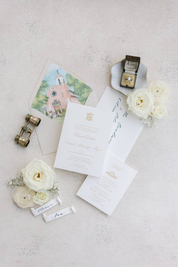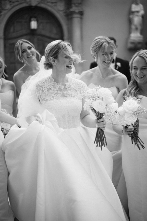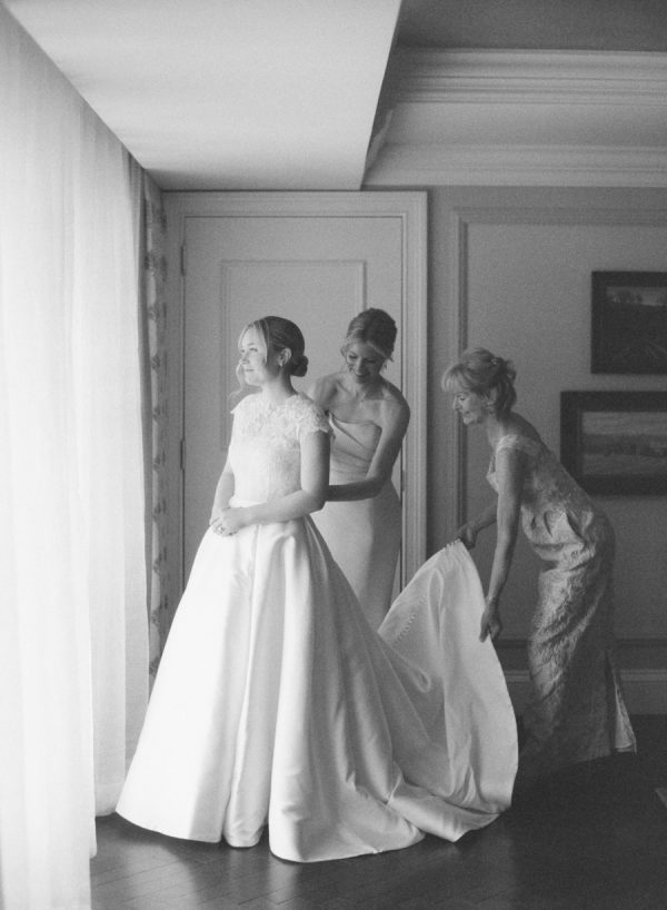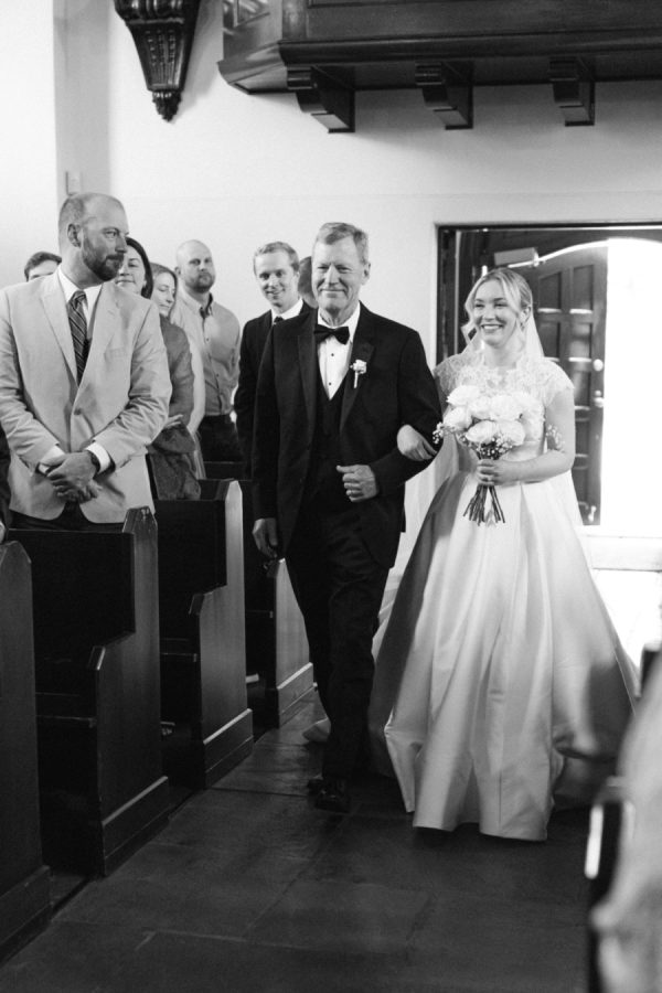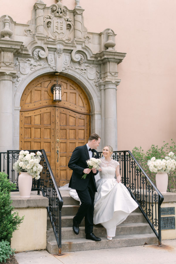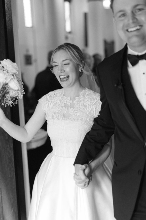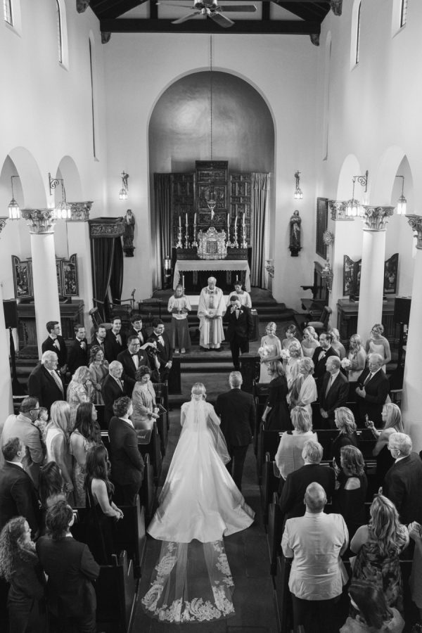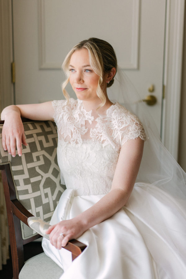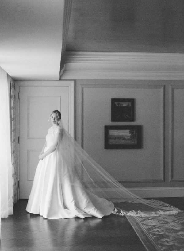 Eleanor wore a classic Anne Barge gown that perfectly echoed the timeless elegance of the day, structured, graceful, and beautifully tailored. For the ceremony, she added a lace topper that carried special meaning: it had originally been worn by her sister at her own wedding, making it a meaningful tribute to family. The layered look felt deeply personal and just right for the sacred setting of the ceremony.