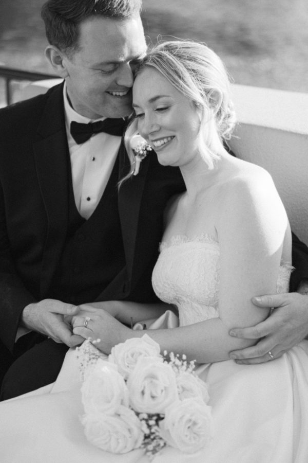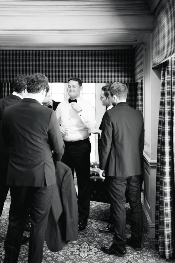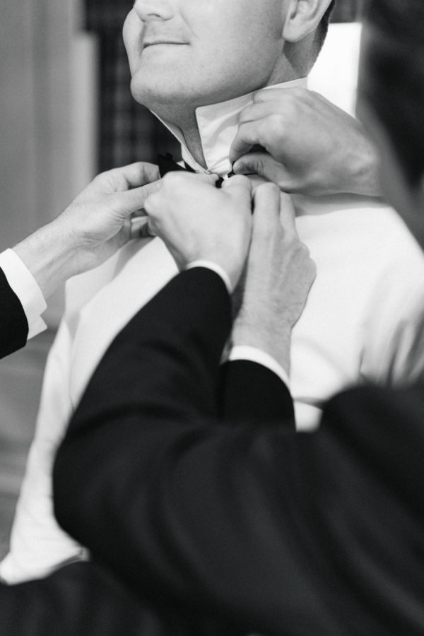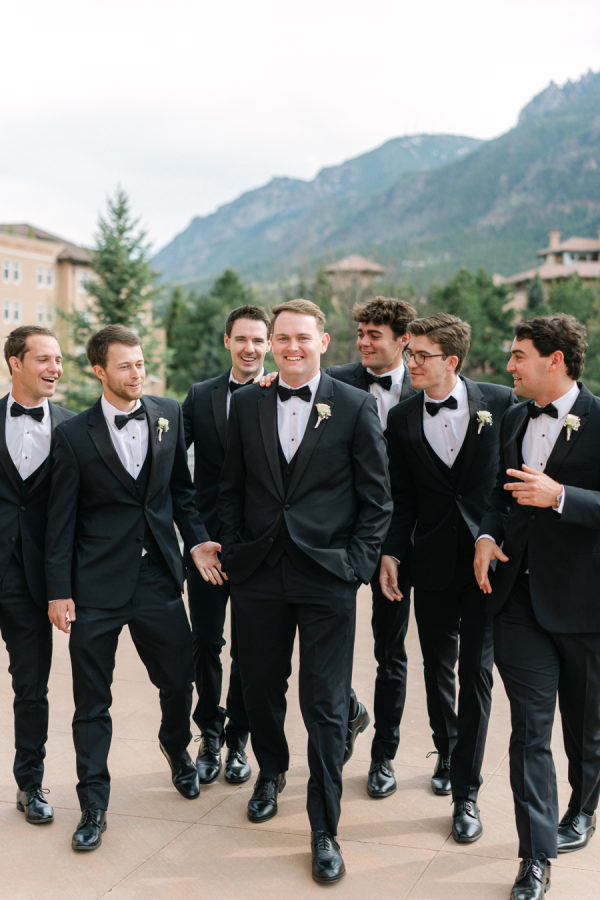 The groom and groomsmen wore classic black tuxedos, a timeless choice that complemented the formal elegance of the day. Sam wore a Calvin Klein tux, while his groomsmen were outfitted in coordinating styles from Gentry Ltd., creating a cohesive and sophisticated look.